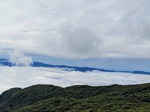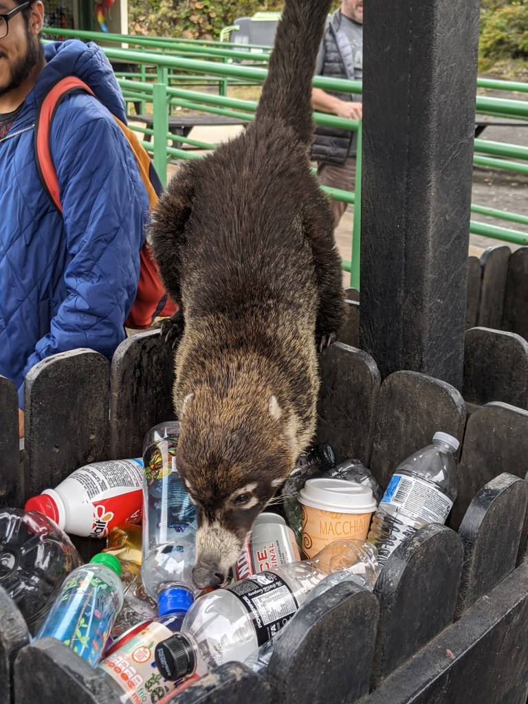 Oben angekommen schauen wir in den schwarzgrauen Schlund des inaktiven Vulkans. Der Nebel hat sich verzogen und die Luft ist frisch und kühl, aber immer noch milder als im Bus. Am Parkplatz treffen wir auf einen Nasenbär, der sich emsig schnüffelnd den essbaren Abfällen in den Tonnen widmet und sich dabei von den faszinierten Touris, welche sämtlich die Handykameras auf ihn richten, in keinster Weise stören lässt.