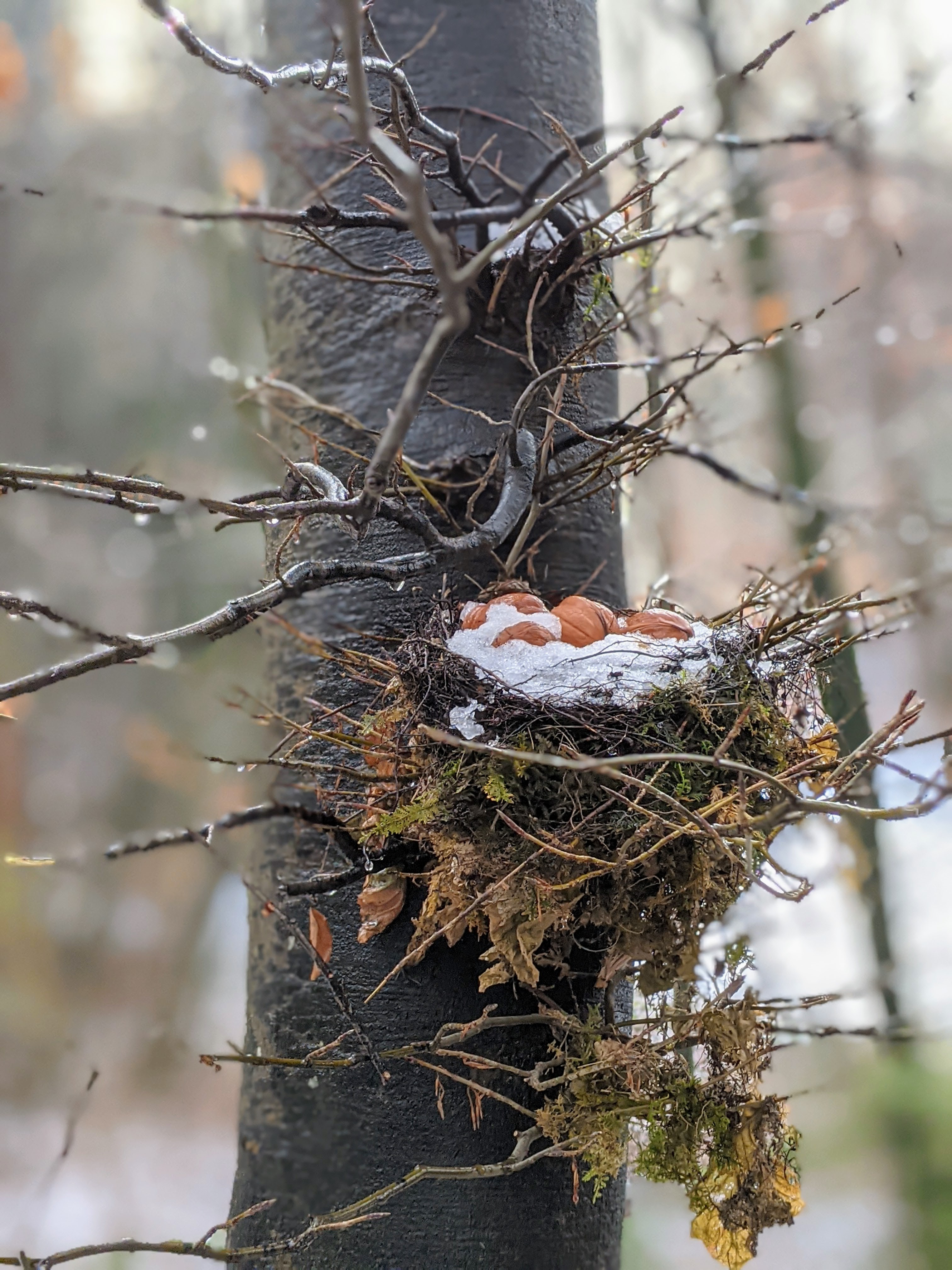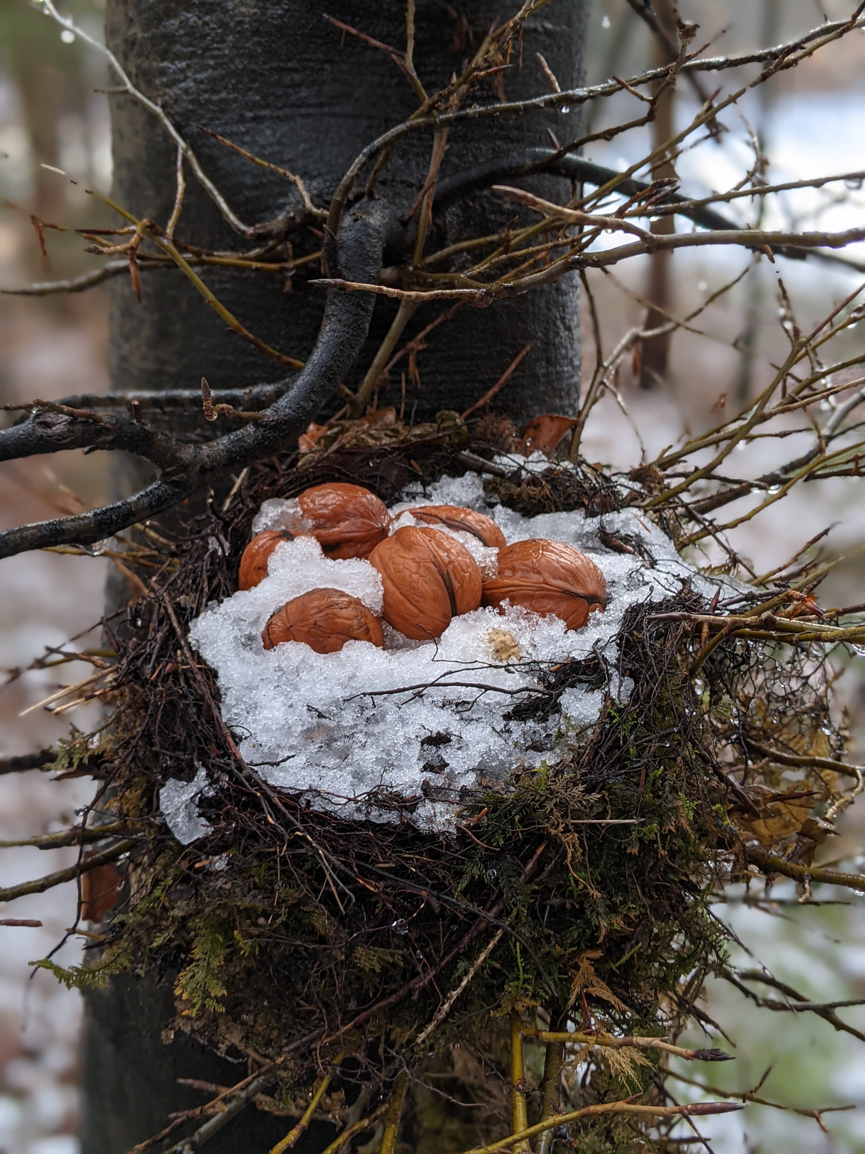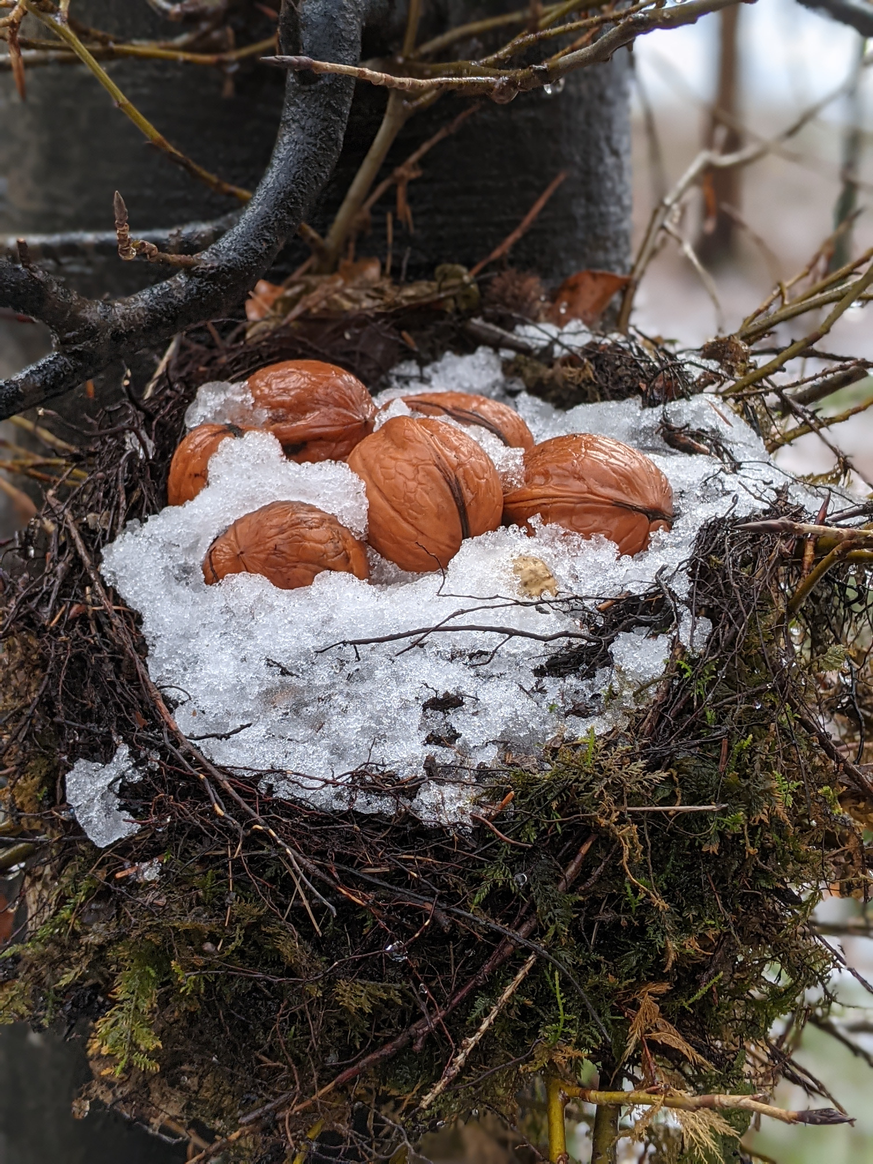 … das ist hier die Frage. Bei unseren ausgedehnten Spaziergängen verwandelt sich mein Techniker von Zeit zu Zeit in ein Geschöpf des Waldes. Immer wenn er mit einem Tannenzapfen nach mir wirft, behauptet er felsenfest, es sei ein Eichhörnchen gewesen. Na klar! Heute jedoch entdeckte er während des Neckens eine Sammelstelle seiner Waldverwandtschaft. Ein Eichhörnchen hat seine Walnüsse in einem Vogelnest deponiert und das Tauwetter legte die blitzblanken Nüsse frei. Ist das nicht entzückend?