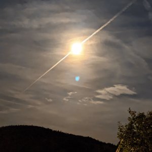 Nein, nicht Spaltung. Teilung meine ich. Der Mond ist nicht die Gesellschaft … Denn als ich gestern in lauer Nacht in den Himmel schaute, sah ich diesen Kondensstreifen, welcher pfeilgerade und mittig den Mond teilte. Spannend dachte ich. Was für tolle Himmelsbilder es doch gibt. Also zückte ich die Pixel 3 Kamera und schoss schnell ein Foto im Nachtmodus.