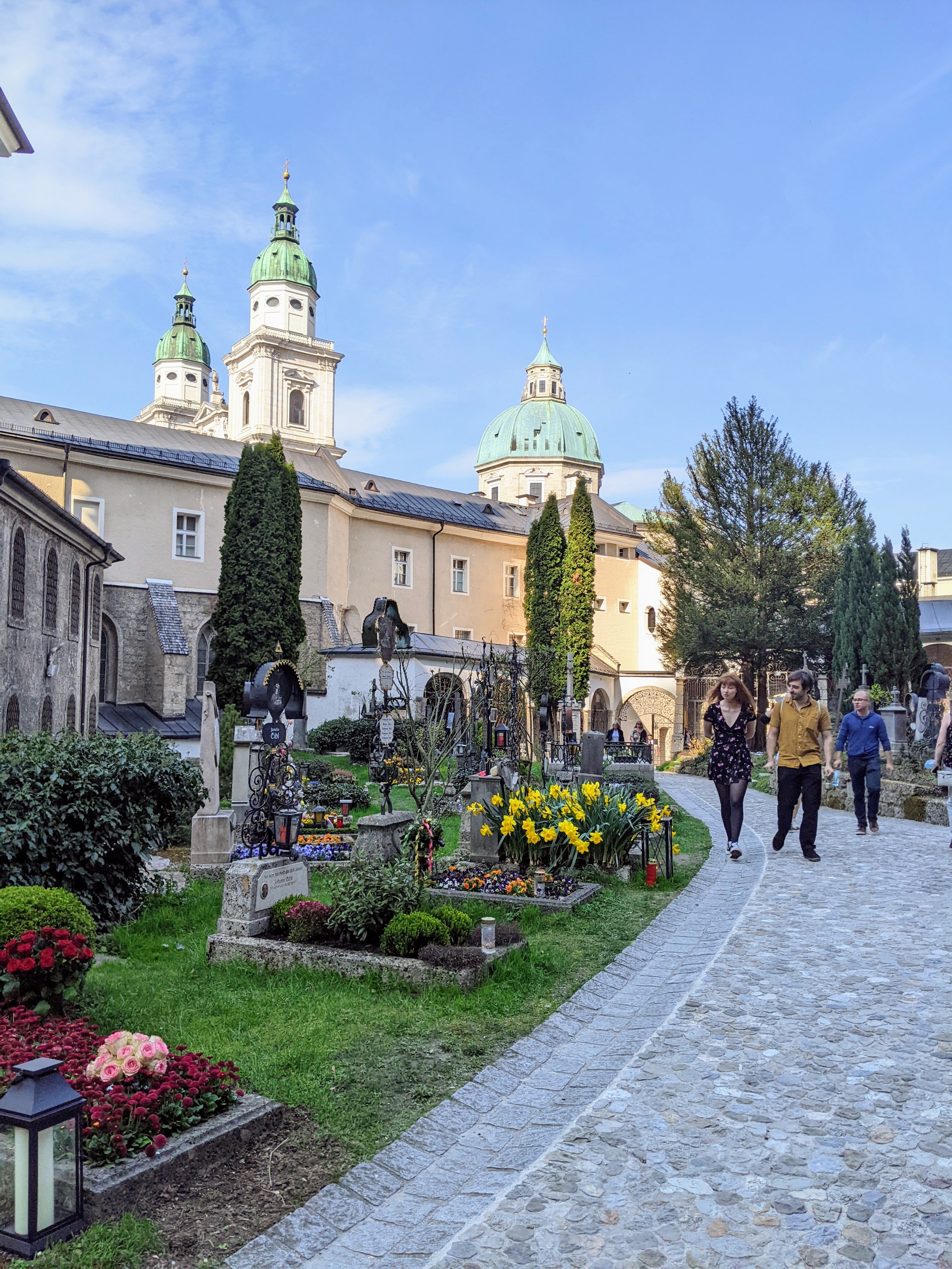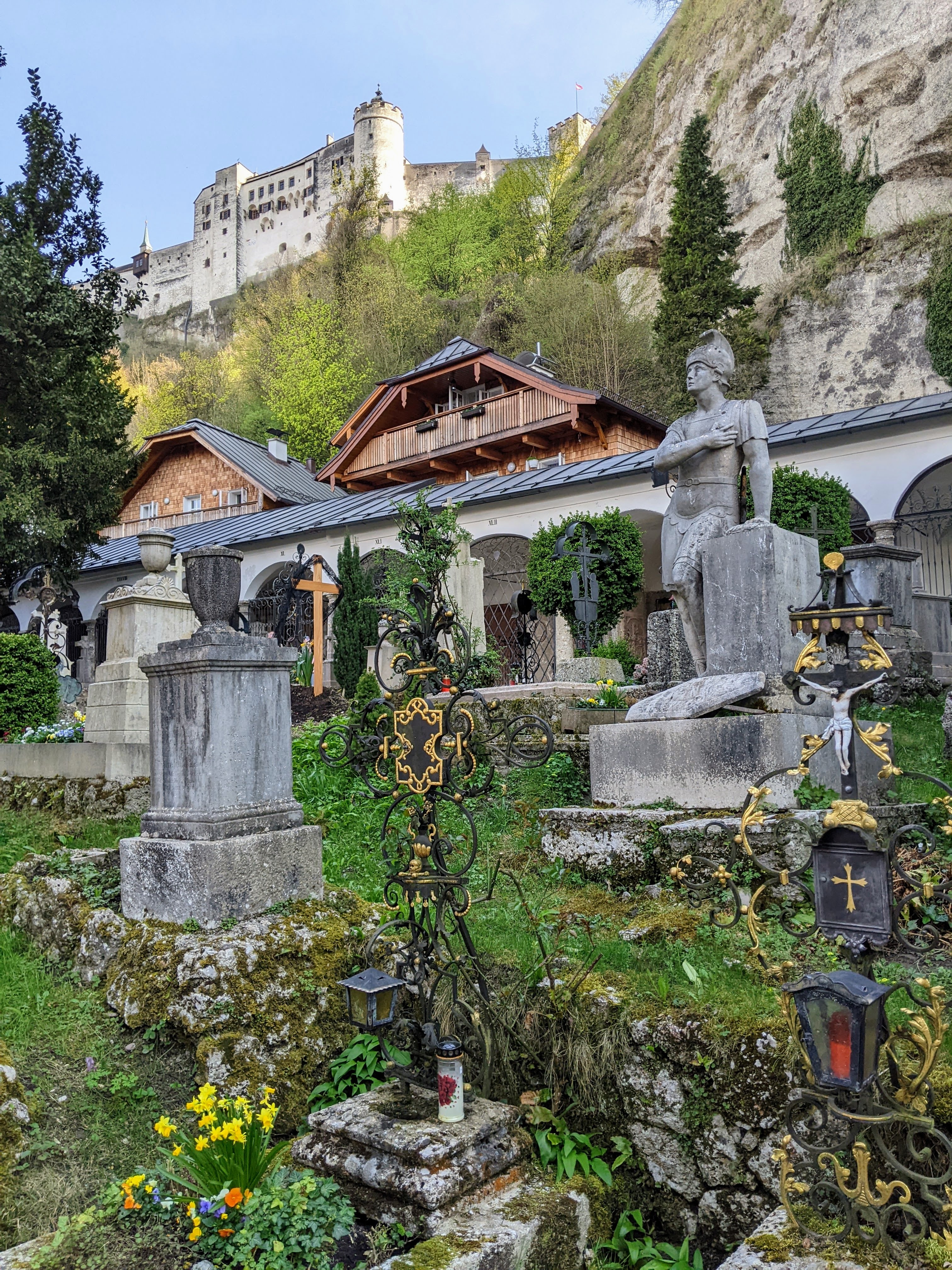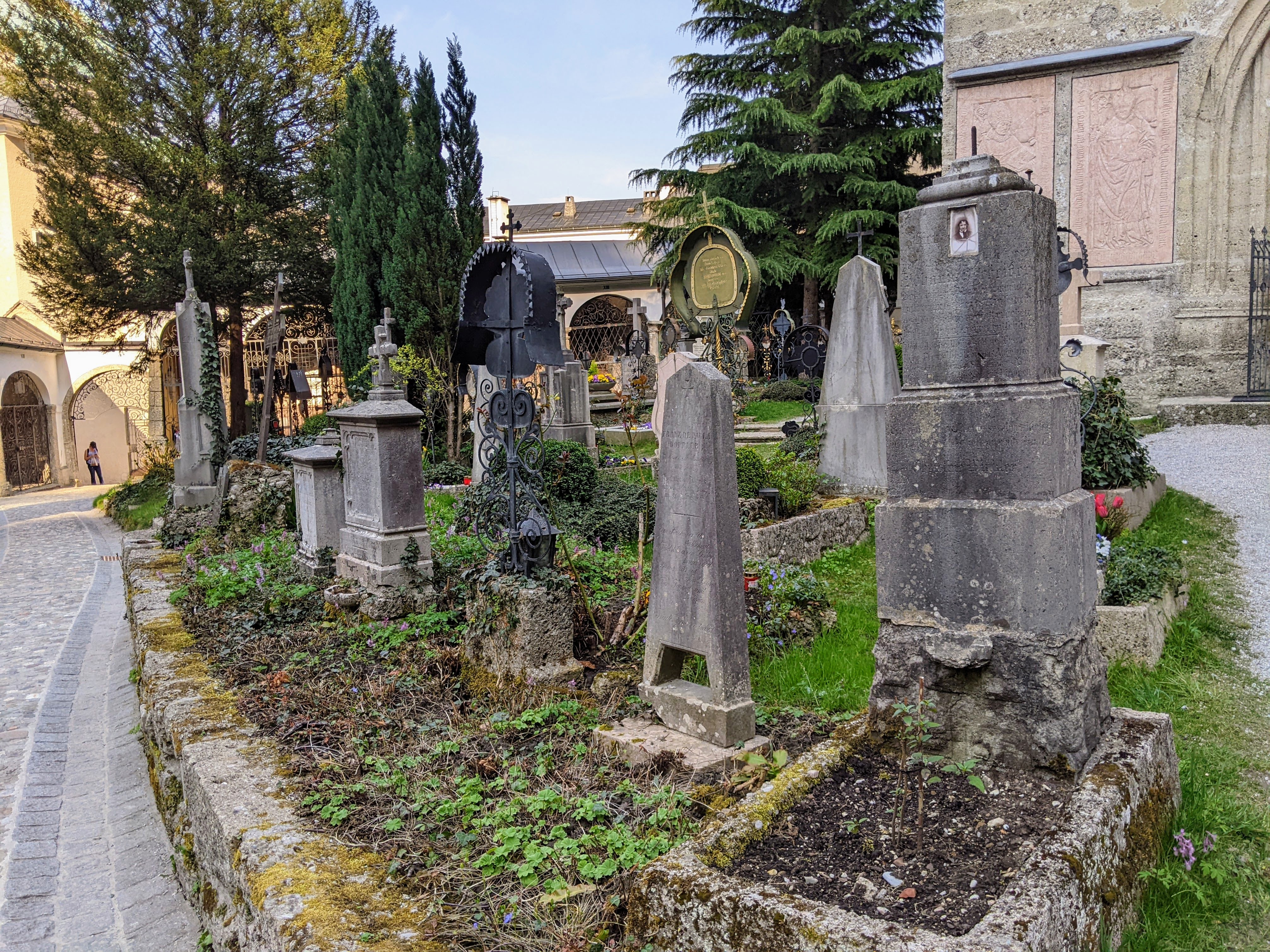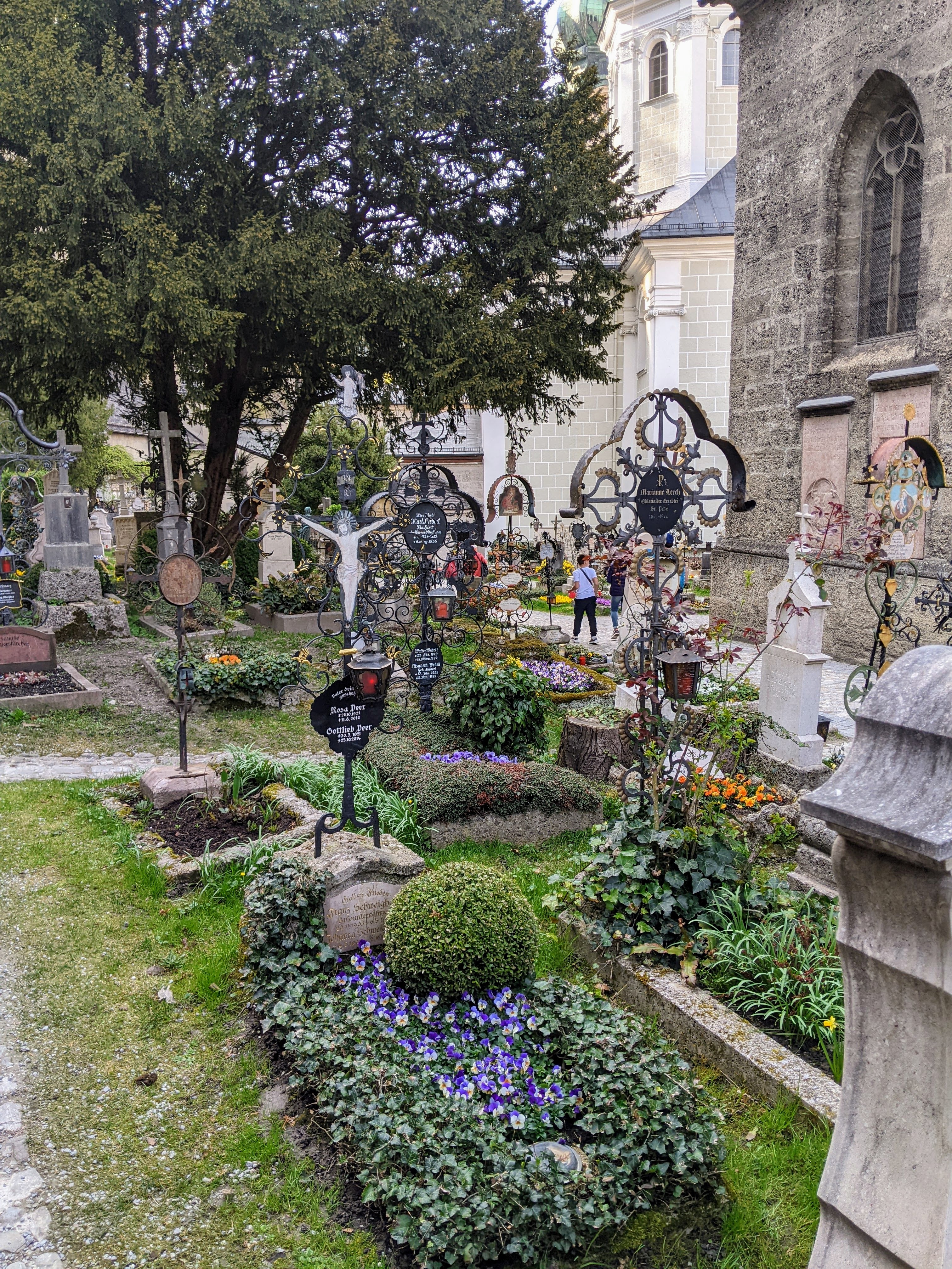 Für ein besonders interessant halte ich den Petersfriedhof in der Salzburger Altstadt. Er gehört zu den touristischen Sehenswürdigkeiten. Ob die Ruhestätten das sein sollten, will ich nicht beurteilen. Aber vielleicht beobachten uns die Seelen der Verstorbenen und freuen sich, dass Leben in die Bude kommt. Dieser Friedhof ist einer der ältesten Salzburgs. Seine Anfänge reichen bis 700 zurück. Er liegt am Fuße der Salzburger Festung. Uralte, in den Fels gehauene Katakomben thronen über den Gräbern. Sie wirken ein wenig unheimlich. Zumindest auf mich.
