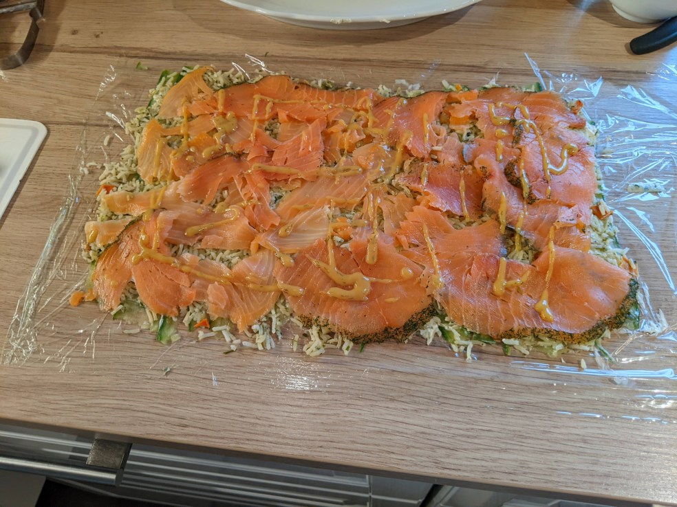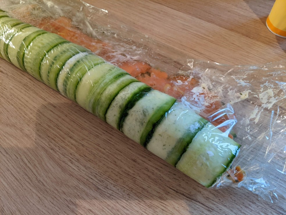 Das Ganze mithilfe der Unterlage vorsichtig einrollen und das Gurken-Lachs-Sushi ist fertig.