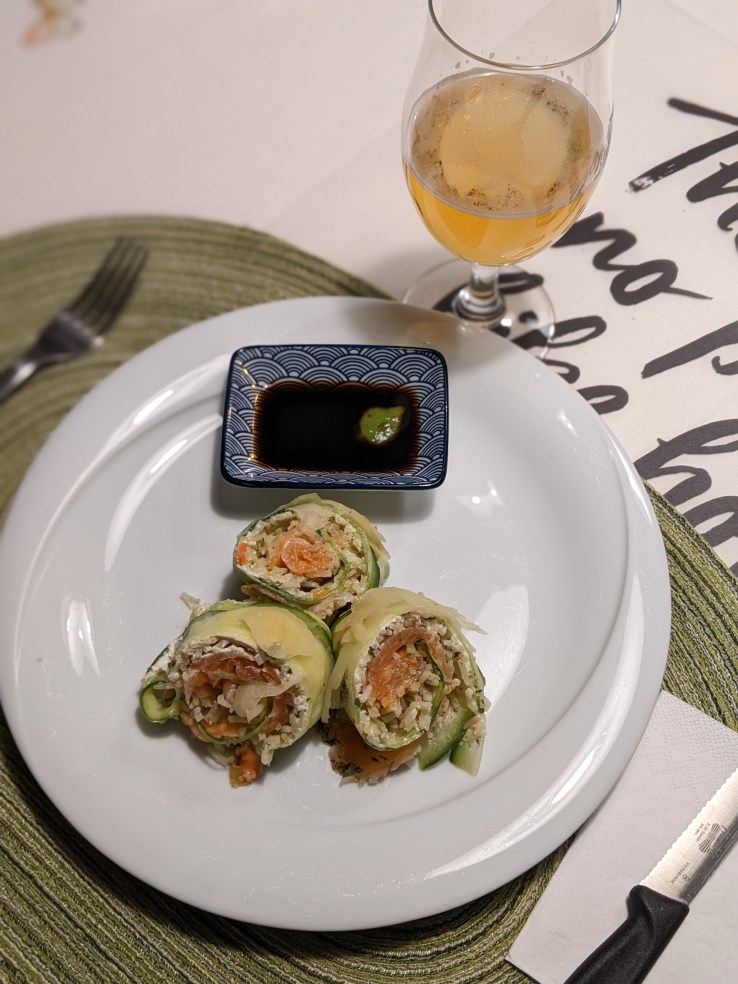 Neulich sah ich eine kulinarische Anregung auf Insta, die mir gefiel und die ich gleich ausprobiert habe. Mein Techniker und ich sind Fans von Lachs-Sushi und statt Seetang Gurke zu verwenden schien mir eine erfrischende Variante.