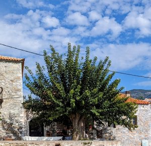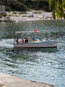 Wir radeln weiter an einsamen Buchten vorbei in Richtung Süden. An einem malerischen Minihafen mit ein paar Fischerbötchen halten wir an. Schön ist es hier. Beschaulich und ruhig. Oberhalb des Hafens, vor einem Steinhaus, sitzen Menschen im Schatten eines Maulbeerbaumes an einem reich gedeckten Tisch. Eine Taverne? Neugierig gehen wir nach oben.