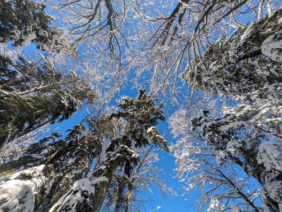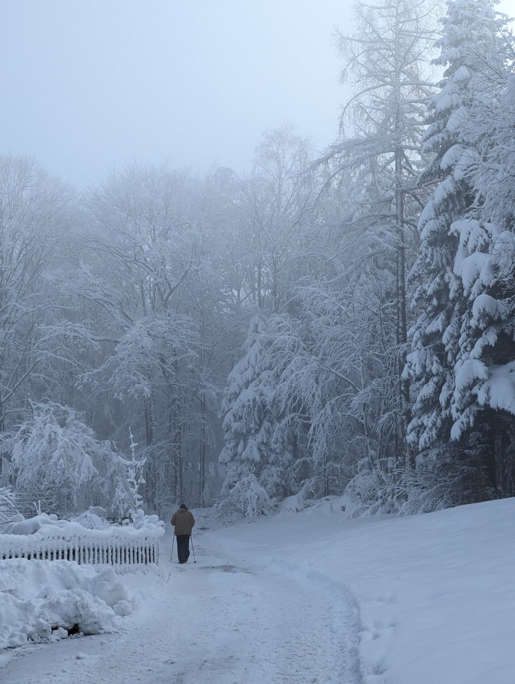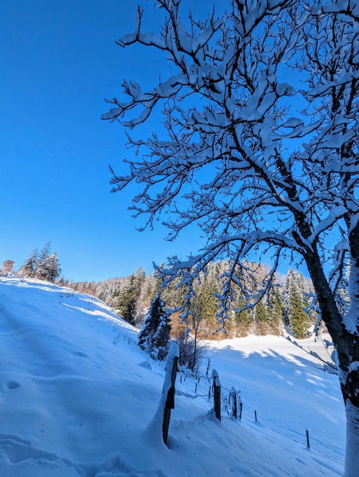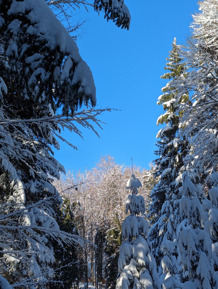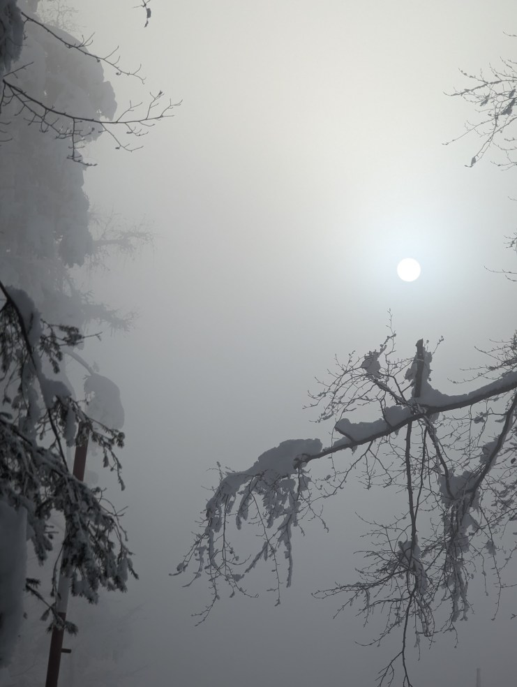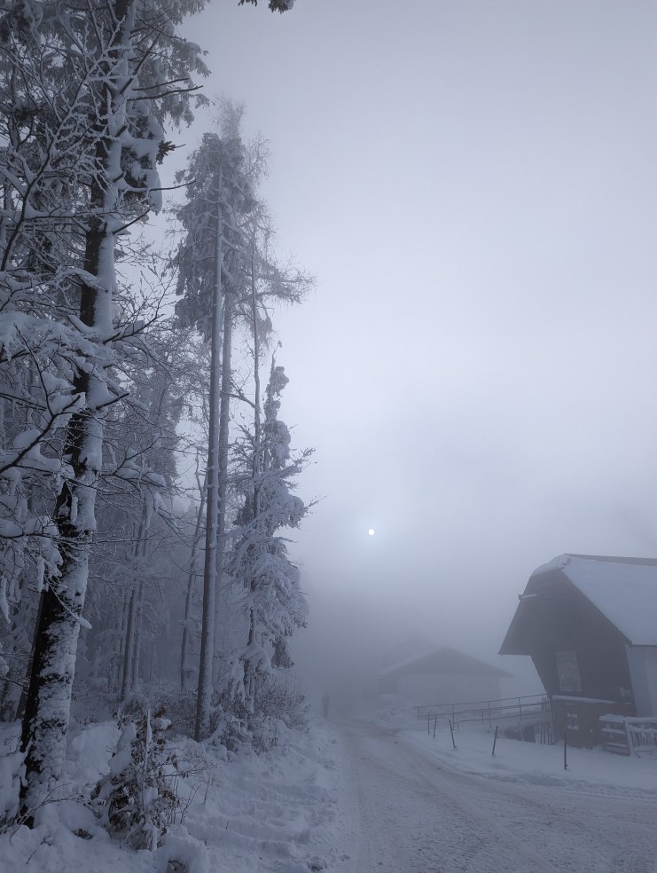 Unsere Wanderung begann mystisch im Nebel, der sich mit zunehmender Höhe auflöste. Mit jedem Atemzug und Meter wurde es freundlicher. Die Sonne blitzte durch die Bäume und am Ende zeigte sich der glasklare, wolkenlose Himmel über der weißen Pracht.