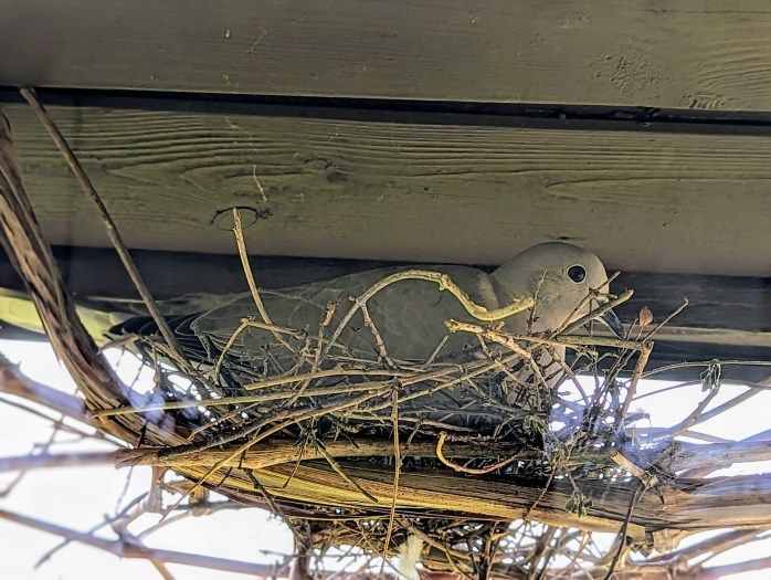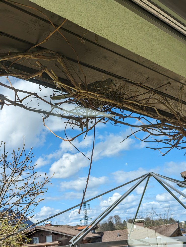 Eine Wildtaube hat sich in unserer Weinranke ein Nest gebaut und brütet dort seit Tagen. Sie lässt sich dabei durch nichts stören.