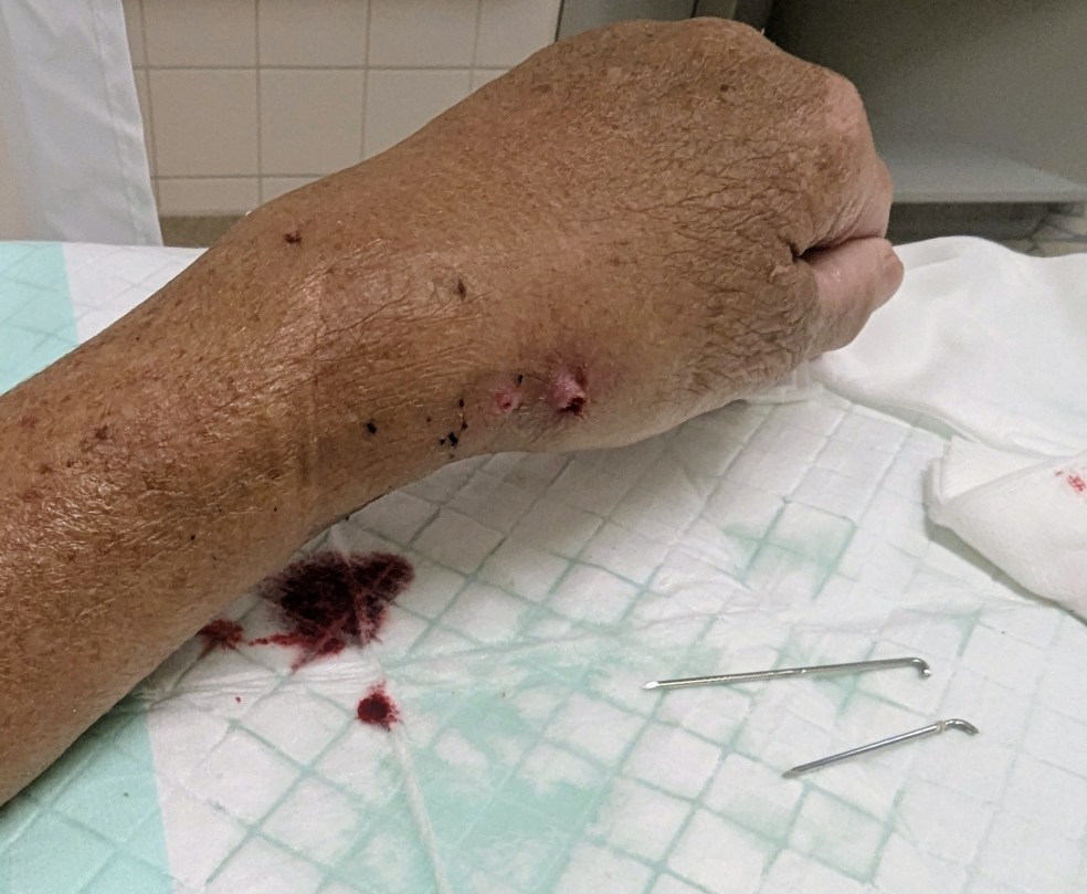 Binnen Sekunden sind die Bohrdrähte herausgezogen. Völlig schmerzlos. Ein wenig Blut ist geflossen, aber kaum der Rede wert. Ich bin erleichtert. Der nächste Schritt ist eine Röntgenaufnahme und wir werden besprechen, wie die Therapie aussehen wird. Sie besteht auf eine stationäre Behandlung. Zweimal wöchentlich im Krankenhaus. Einen Monat lang. Dann sehen wir weiter.