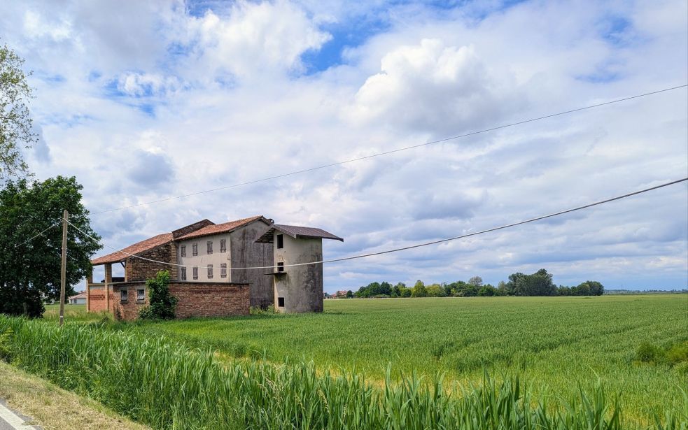 Verlassene Bauernhöfe in der Landschaft stehen.