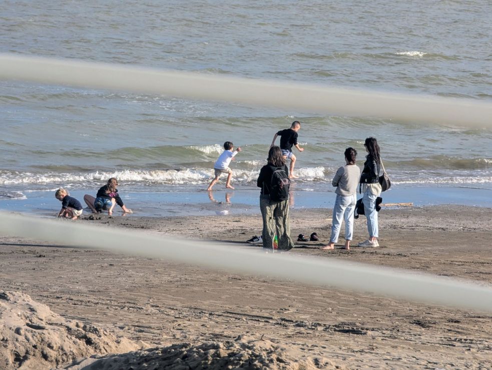 Kinder mit ihren Eltern ausgelassen am Strand spielen.