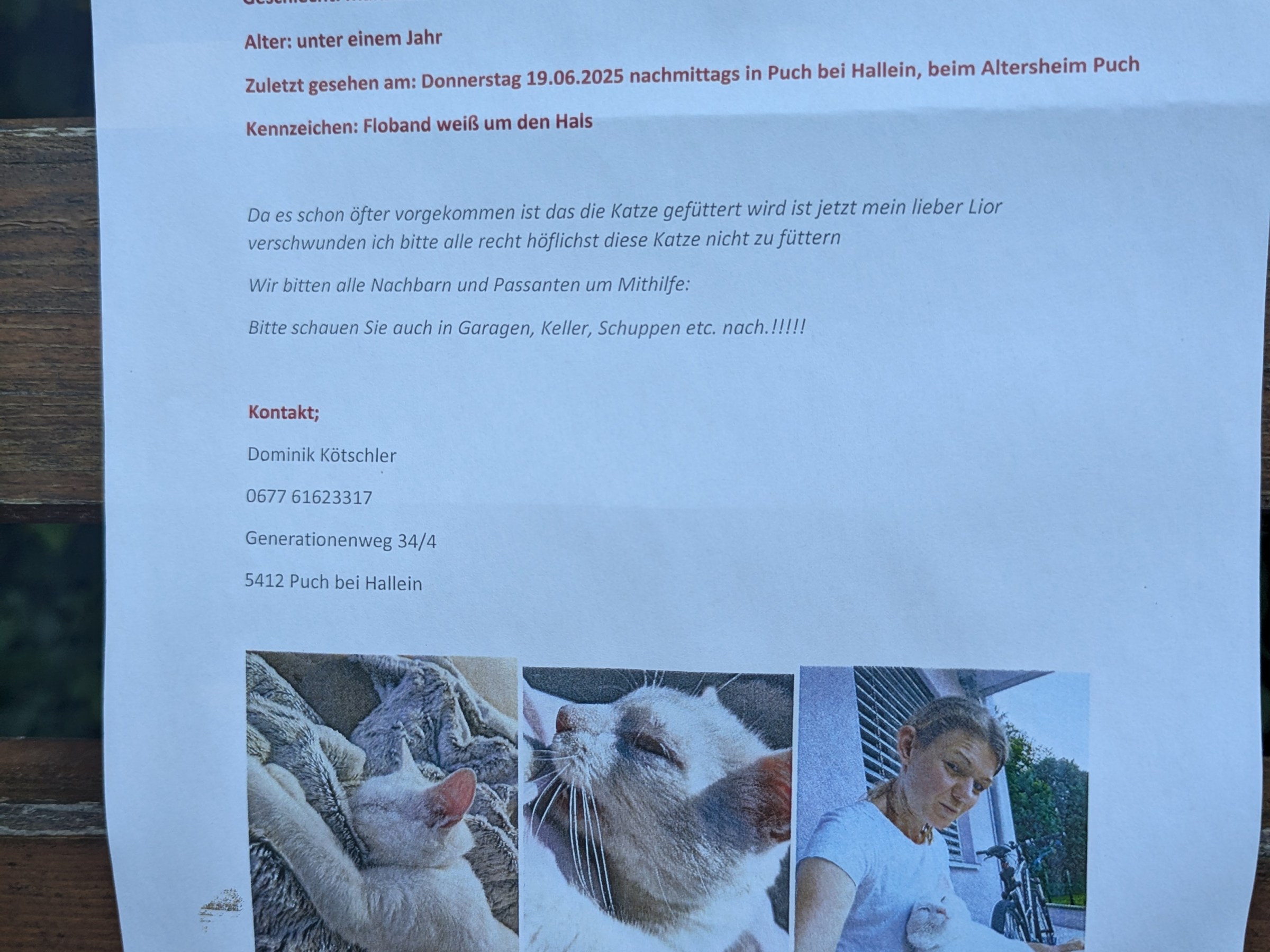Ein Weilchen saßen wir noch beisammen, dann machte ich mich wieder auf den Weg und das Kätzchen verschwand in den Büschen. Mein Techniker meinte später, es hätte wohl den elektrischen Impuls der Batterie gespürt, aber seltsam fand ich es trotzdem. Einige Tage später sah ich mehrere Aushänge, auf denen ein weißer Kater namens Lior als vermisst gemeldet wurde. Fotos und Name anbei. Ihre Zutraulichkeit ist ihr vielleicht zum Verhängnis geworden, dachte ich. „Wahrscheinlich hat ihn jemand mitgenommen“, meinte mein Mann.