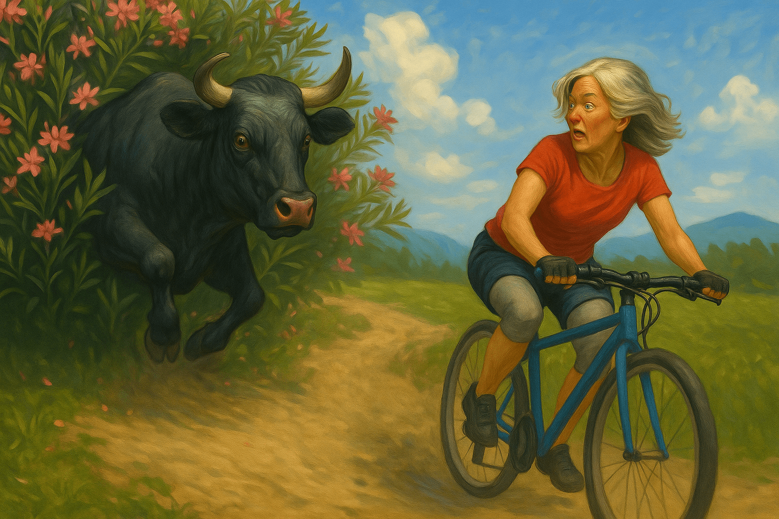 Schock Wir waren mit unseren Rädern auf dem Weg vom Dorf zum Campingplatz. Plötzlich brach rechts von mir etwas großes graues durch das Dickicht der Oleanderbüsche. Eine wild gewordene Kuh! Panisch rannte sie knapp vor mir über die Straße, um nach ein paar Sekunden… Continue Reading „Achtung Kuh von rechts 🐮!“