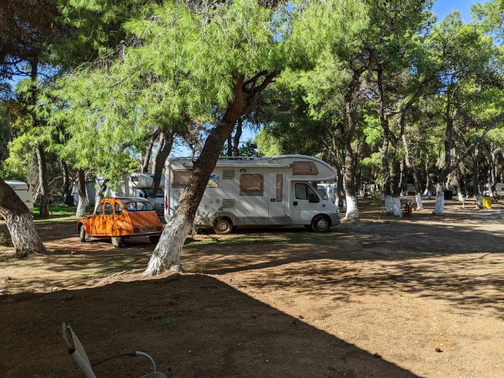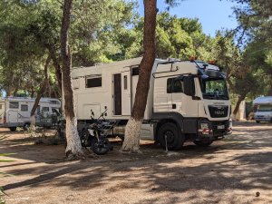 Unser letzter Stellplatz in Griechenland nennt sich Camping Kalami und ist sechs Kilometer von den Fährenterminals entfernt. Aufgrund der guten Lage für Camper im Transit, ist der Platz gut gebucht. Wir haben Glück und stehen direkt am Meer. Es gibt ein Restaurant, die sanitären Anlagen sind in Ordnung und die Betreiber freundlich. Vier Tage Wartezeit vergehen wie im Flug. Am Ende fällt sogar dem Techniker der Abschied schwer.