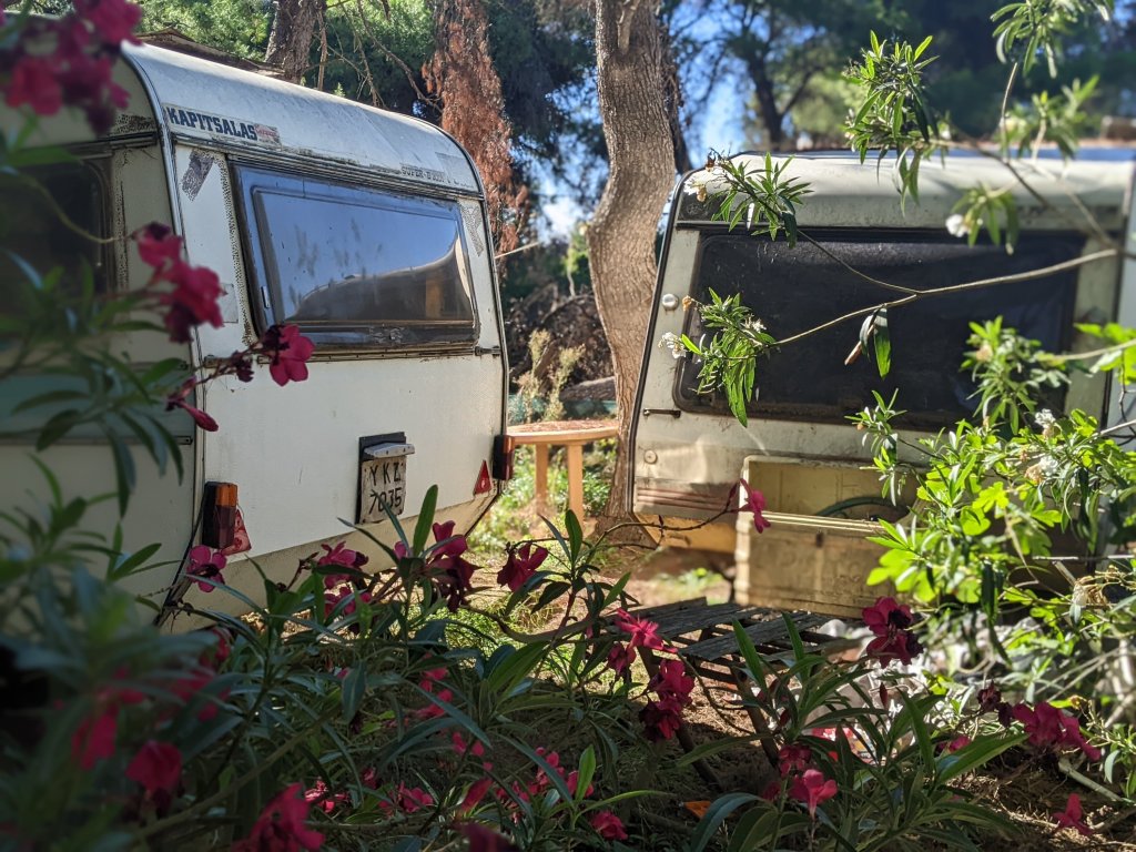 In der ersten Nacht parkt eine junge Griechin neben uns. Sie hatte Angst, so alleine, erzählt sie mir am nächsten Morgen. Den Tag verbringt sie mit ihrem Hund allein am Strand. Nachts stellt sie sich mit ihrem kleinen PKW lieber an Würstelstands schützende Seite. Ansonsten haben wir das gesamte Areal und den Strand für uns alleine.