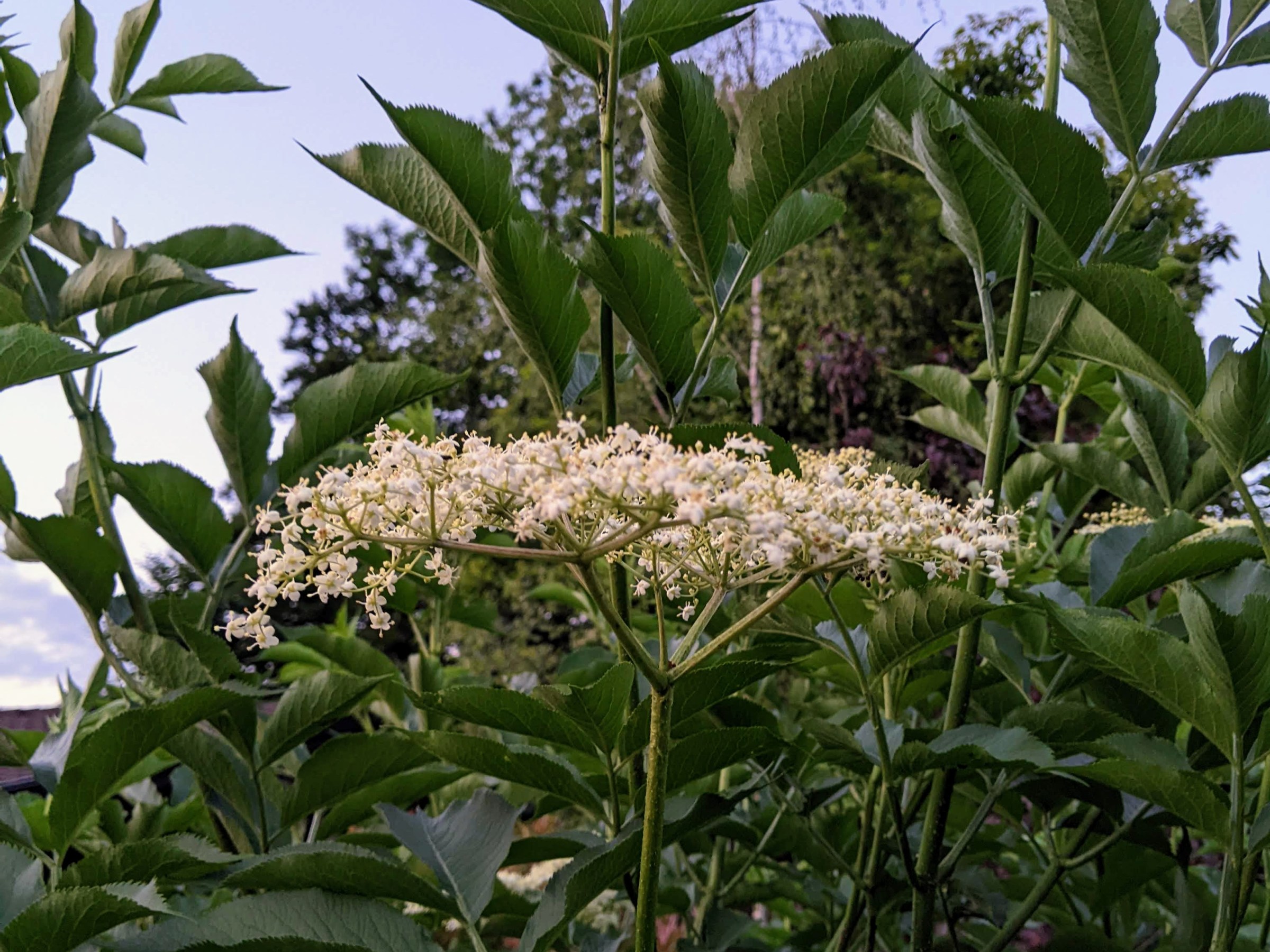 Vor vier Jahren brach ich einen Holunderzweig im nahen Wald, brachte ihn zum Wurzeln und kultivierte ihn vorerst im Blumentopf. Nach einem Jahr setzte ich ihn ins Freie. Inzwischen ist er zu einem stattlichen Strauch herangewachsen und trägt heuer erstmals unzählige Blüten.