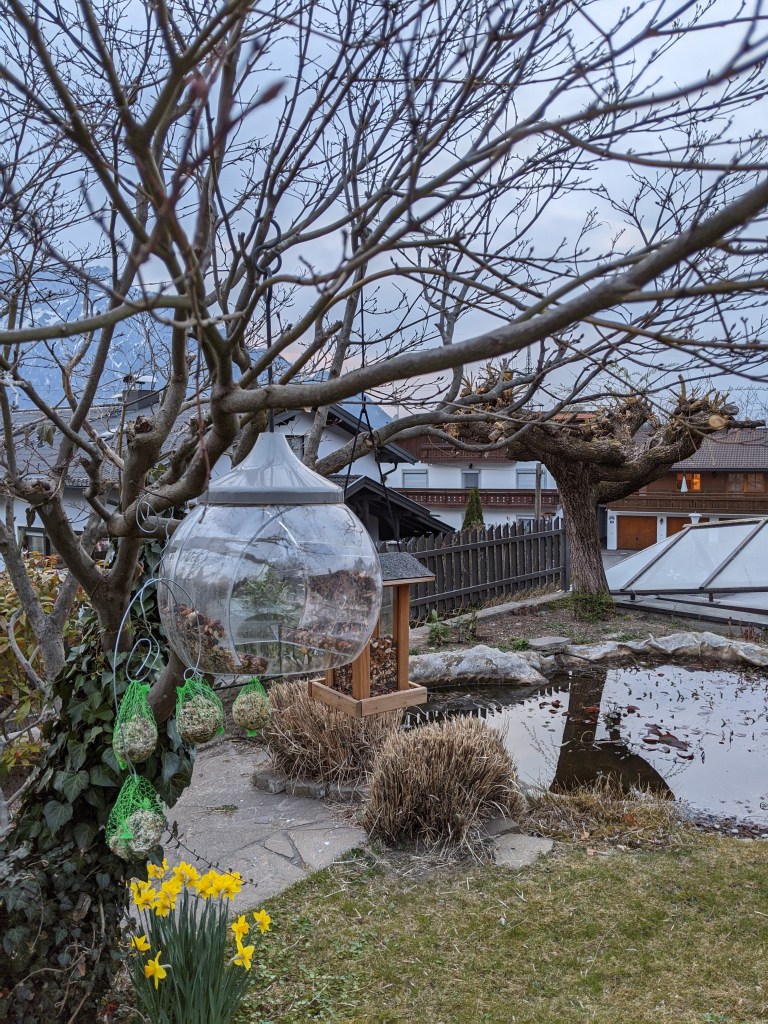 Mein Techniker hatte große Bedenken, ob die Vögel unter die schützende Glasglocke fliegen würden. Gesehen hab ich’s nie, aber sicher sind wir beide nicht. Das herkömmliche Futterhäuschen daneben blieb ebenfalls nahezu ungenutzt.