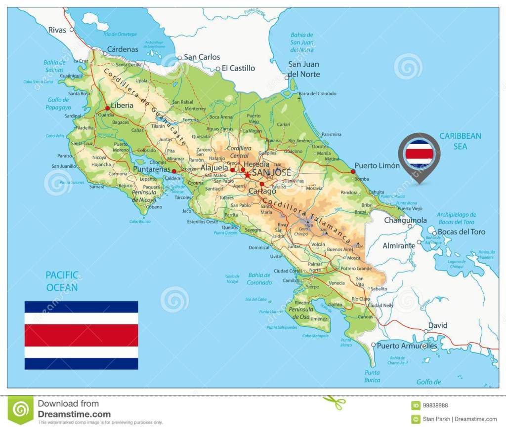 | Geografie: Topographisch lässt sich Costa Rica in fünf Großräume gliedern. die vulkanischen Bergketten der Cordilleras, speziell die Cordillera de Talamanca das Valle Central mit der Hauptstadt San José die Schwemmlandebenen der Karibikküste die zentrale Pazifikküste die trockene Halbinsel Guanacaste im Nordwesten In den Cordilleras gibt es eine Vielzahl noch aktiver und auch erloschener Vulkane, darunter der Turrialba. Die drei am meisten besuchten sind der Volcán Poás (2704 Meter), der Arenal (1633 Meter) und der Irazú (3432 Meter). Der Chirripó Grande (3820 Meter)[5] ist der höchste Berg des Landes. (Quelle Wikipedia) |
