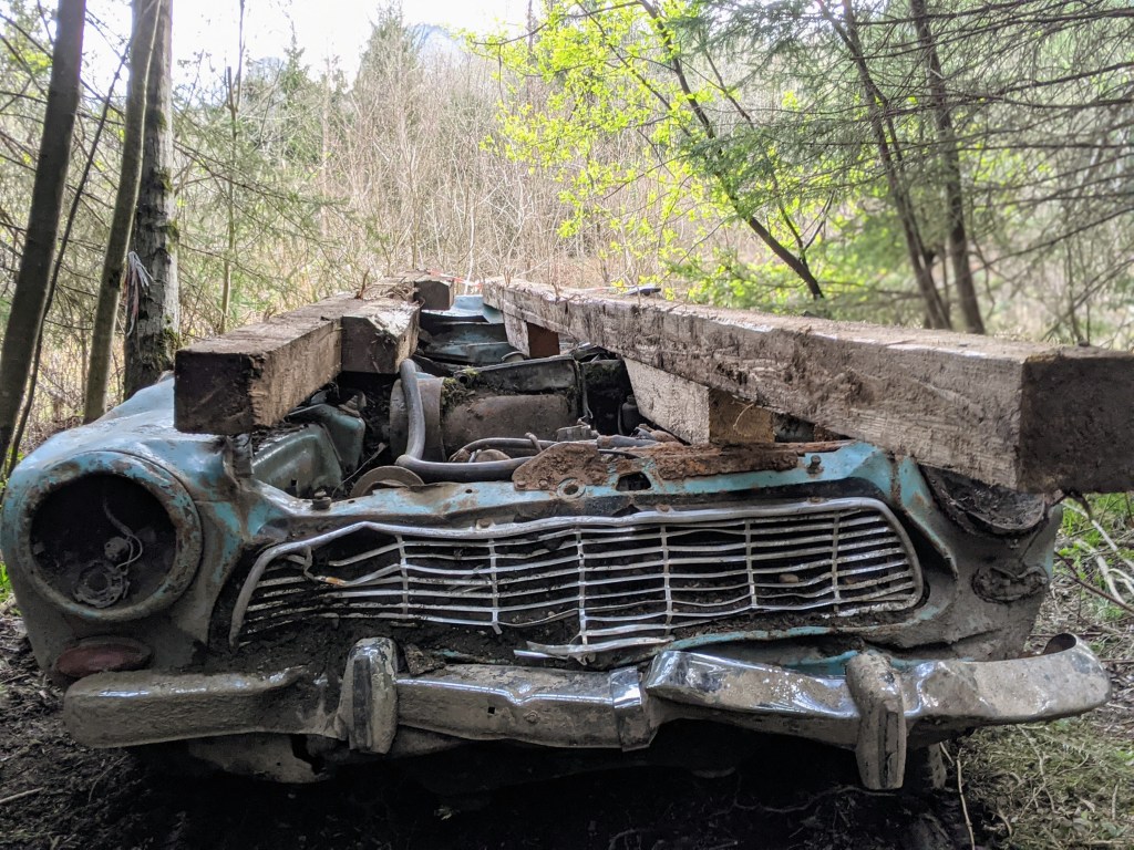 Gestern wanderten wir wie so oft durch den Auwald. Wo sonst nur Büsche, Bäume und Natur pur zu sehen ist, stand plötzlich ein kitschig – türkises Autowrack mit ein paar Holzbalken obenauf. Wir staunten nicht schlecht. Woher kam es? Vor ein paar Tagen war hier noch nichts davon zu sehen gewesen. Konnte es sein, dass jemand in tiefster Frustration seinen Oldtimer entsorgt hatte, weil das Restaurieren des guten Stückes zu mühsam war?