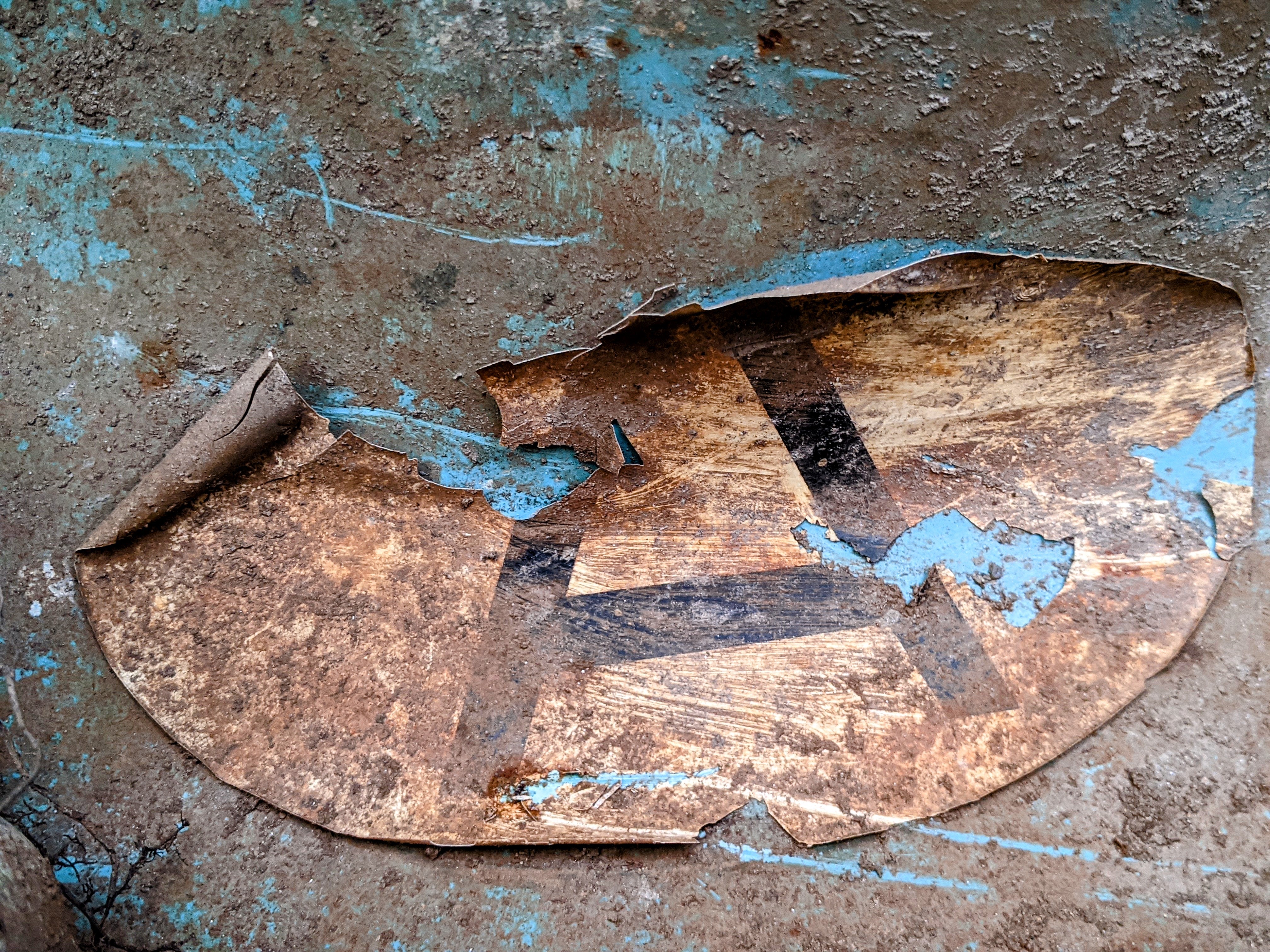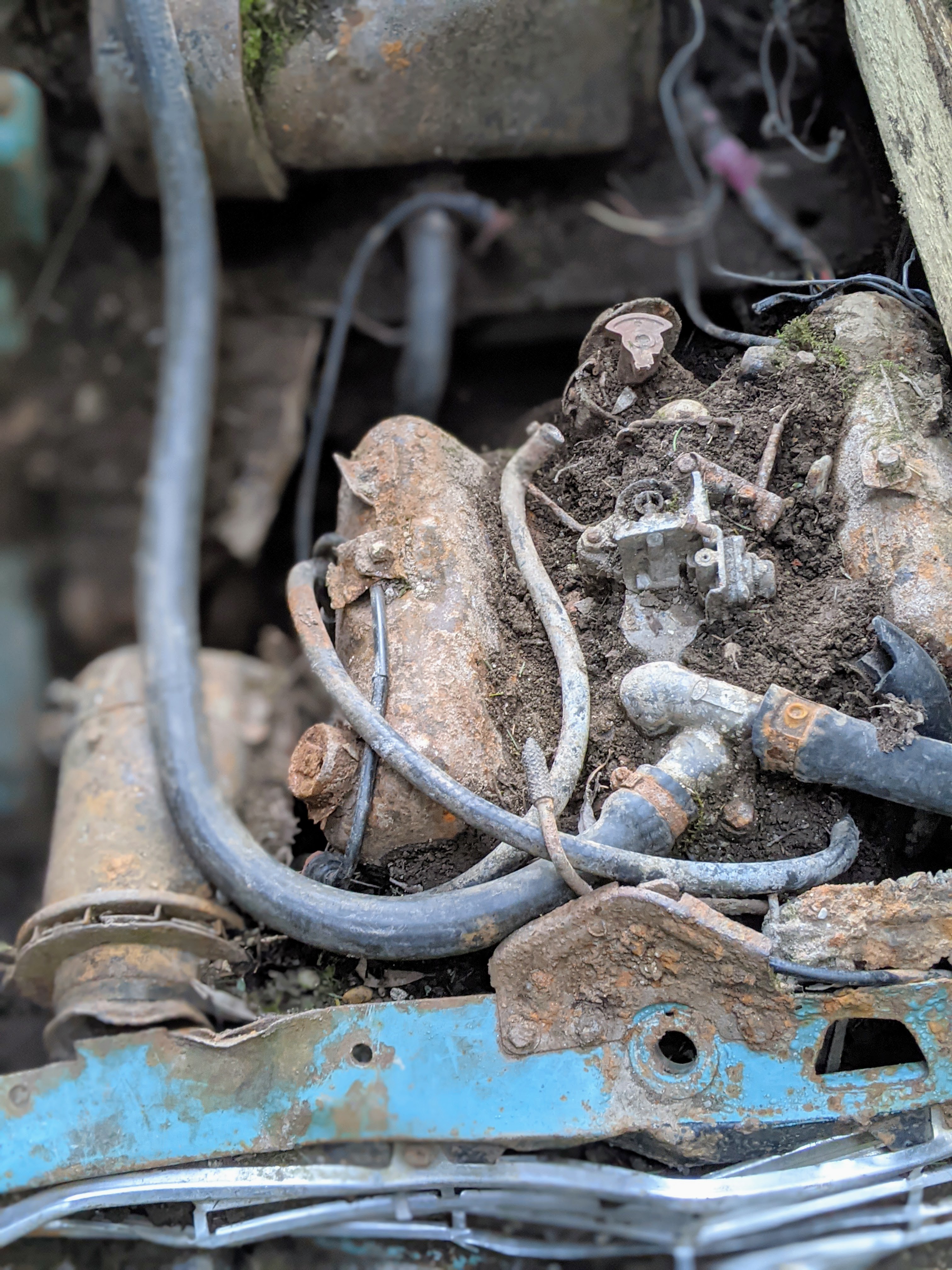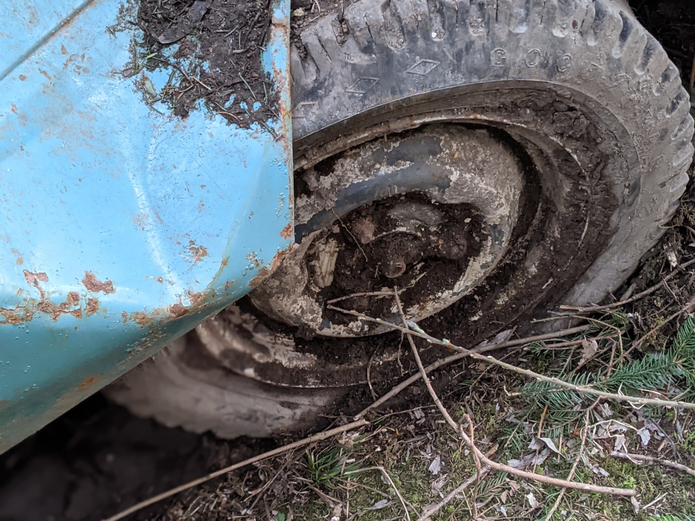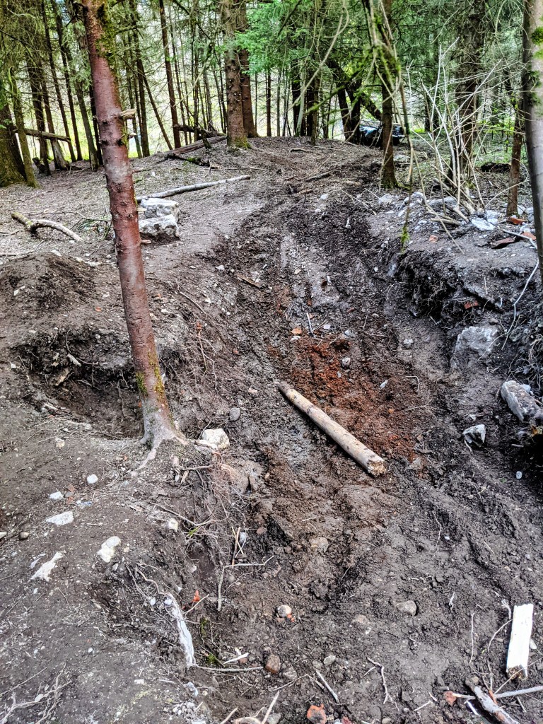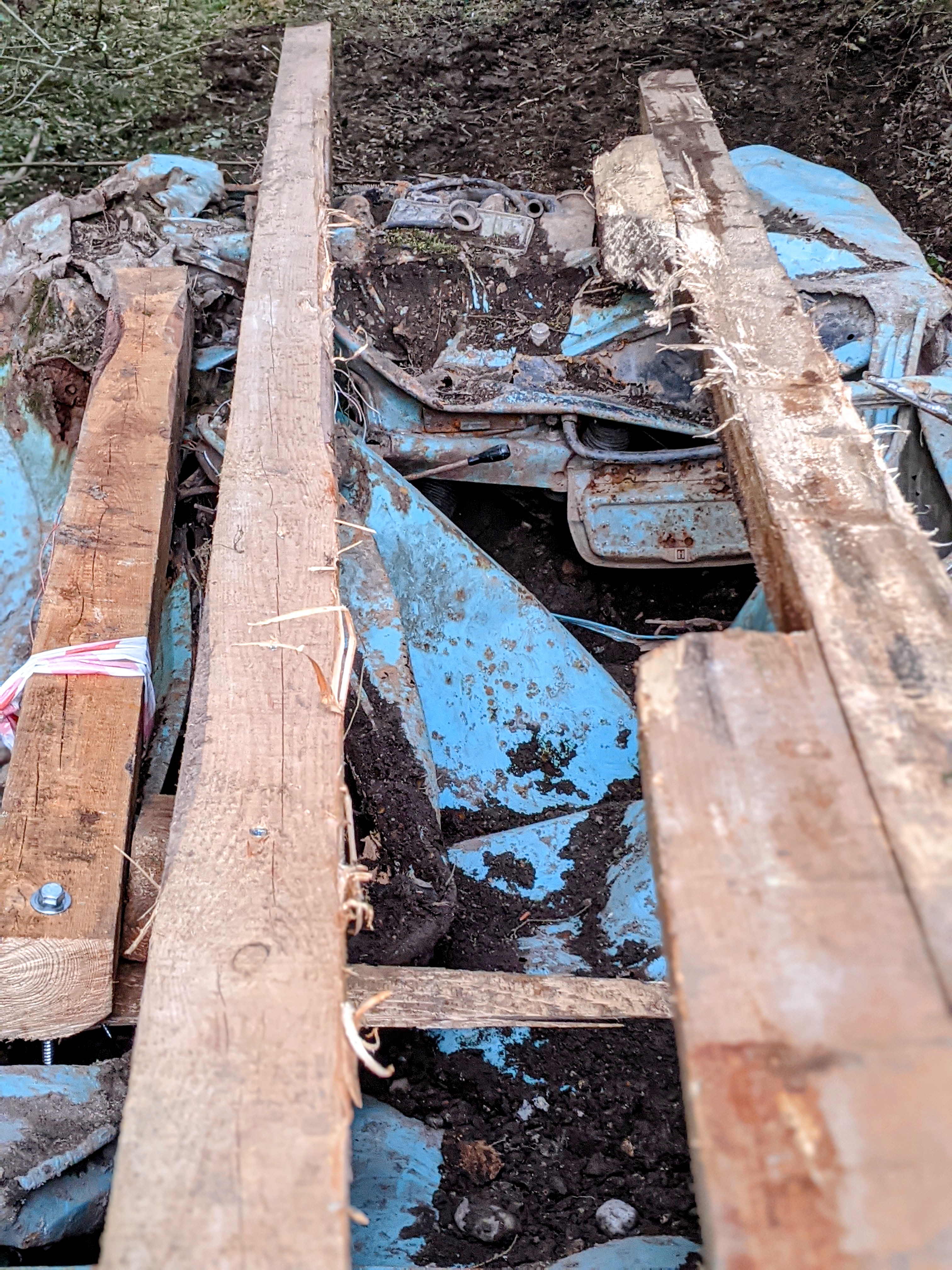 Die Farbe erinnerte mich spontan an die Filme aus den Fünfzigern. An Elvis und Mädels in Petticoats …Aber ich schweife ab …Nachdem wir tiefe Schleifspuren vor dem Wrack entdeckten, folgten wir den Spuren in den Wald. Nach circa 50 Metern fanden wir einen tiefen Graben, in dem das Auto gelegen hatte. Irgendjemand hatte den Wagen entdeckt und ausgegraben. Spielende Kinder? Ich stellte mir vor, wie sie aufgeregt zu ihren Eltern rannten und von ihrer Entdeckung erzählten. Aber vielleicht war es auch ganz anders. Meine Fantasie ist grenzenlos …