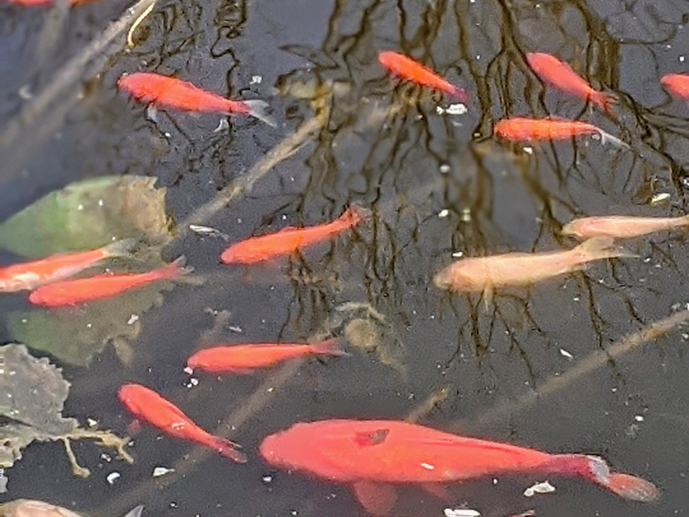 Auch unsere Goldfische genießen die ersten warmen Frühlingstage und schwimmen gemeinsam mit dem Chef des Clans knapp unter der Oberfläche, um ein Sonnenbad zu nehmen. Den Teich gibt es schon seit 50 Jahren und lange Zeit war der älteste Fisch ein stattliches goldfarbenes Exemplar. Scheinbar ist er in den Fischhimmel aufgestiegen, denn ein mittelgroßer orangeroter mit weißer Heckflosse hat heuer die Führung des Schwarmes übernommen. Erstaunlich finde ich, dass diese robusten Wasserbewohner bis zu 25 Jahre alt werden und selbst die kältesten Winter überleben. Wir haben uns vorgenommen, den Teich heuer von einem Teil des Schlammes zu befreien. Der Teich wird dadurch tiefer und die Tiere haben auch unter einer dicken Eisdecke mehr Platz. Sie sollen sich ja wohlfühlen. Wie es einem Fisch im Wasser eben gebührt.