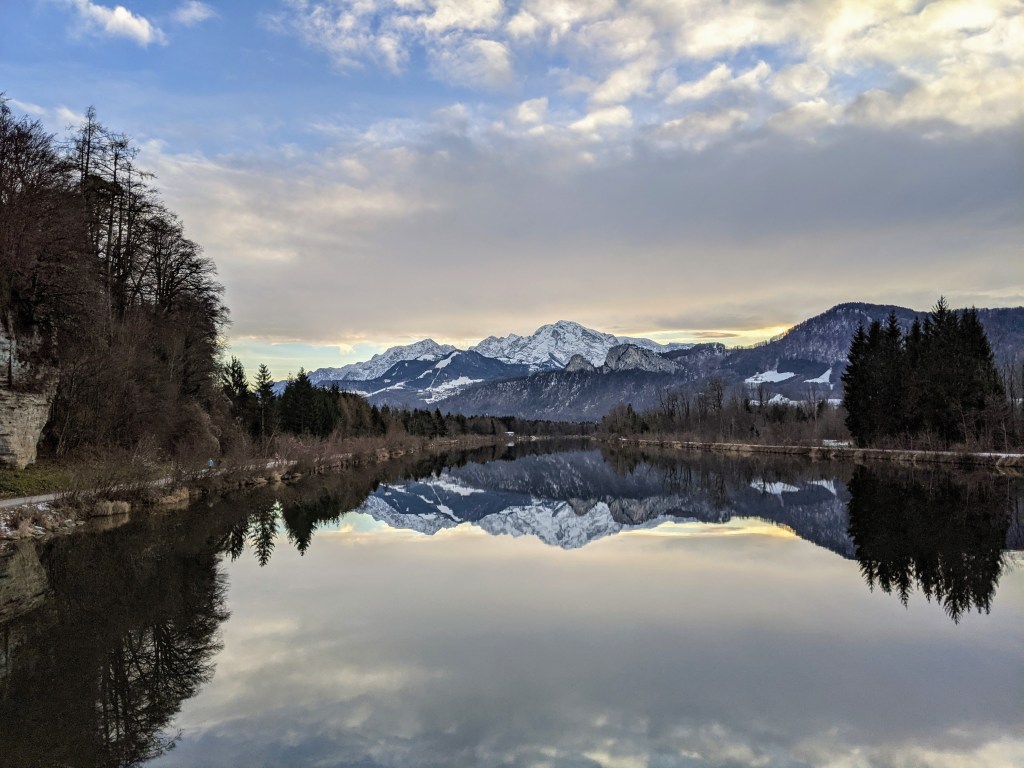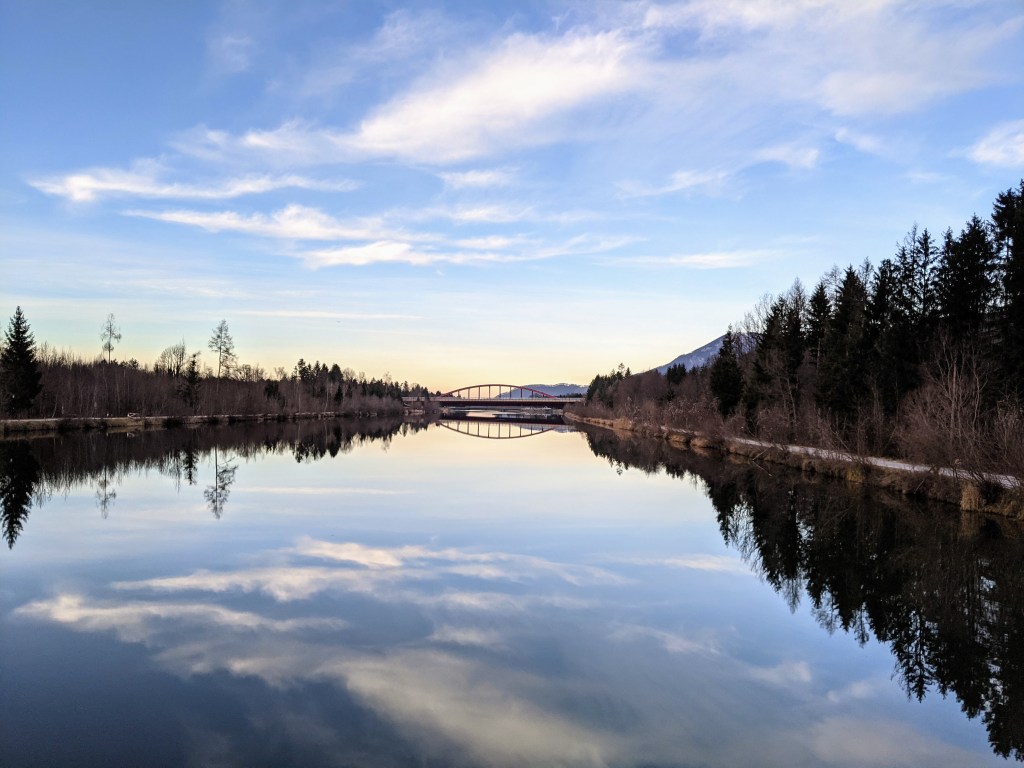 Wir schlendern entlang des spiegelnden Flusses und erfreuen uns des Farbenspiels, der Stille und des Anblicks