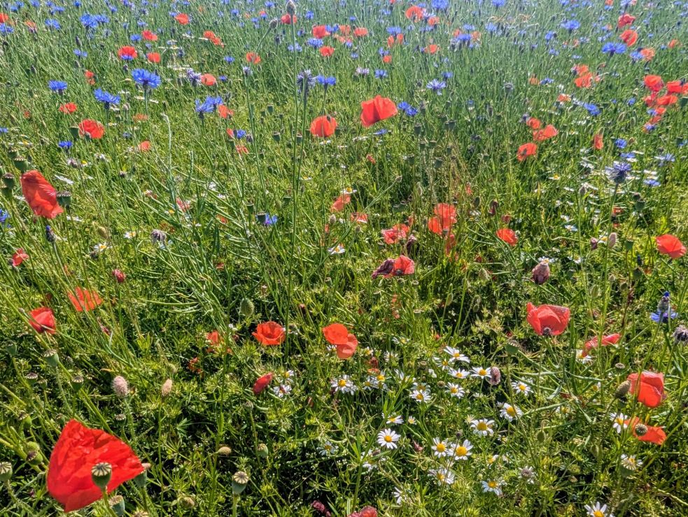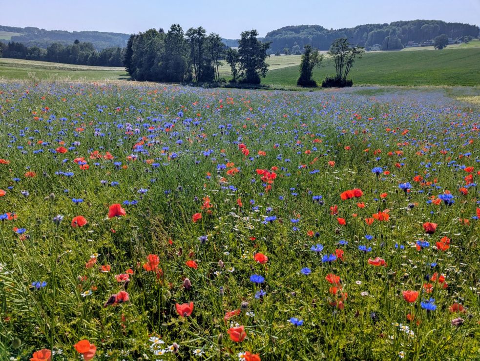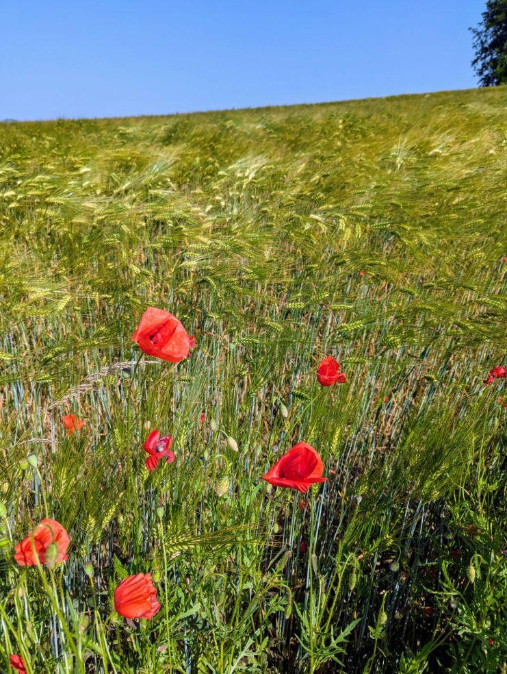 Muck, unser Wohnmobil, steht schon seit einer Woche beim Bauern am See. Heute ist ein Traumtag! Nur die Asche der Waldbrände in Kanada trübt etwas den Himmel. Leider darf ich nicht in die Sonne, aber putzen und aufräumen geht. Nach getaner Arbeit eröffnen sich bei der Rückfahrt durch die bäuerliche Kulturlandschaft wunderbare Aus- und Ansichten. Ähren wiegen sich im Wind. Korn- und Mohnblumen leuchten um die Wette. Auf einem Feldweg bleibe ich stehen und fotografiere. In diesen Momenten wünsche ich mir eine Profikamera, um diese Pracht richtig besser einzufangen. Aber ich denke, die Aufnahmen sind mit der Handykamera recht gut geworden.
