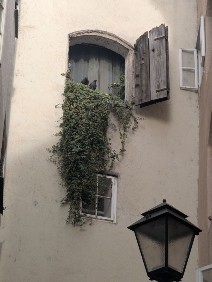 Ostersonntag in der Steingasse in Salzburg. Oh, denke ich mir, was für ein romantisches Plätzchen sich die beiden Täubchen ausgesucht haben … Ich zoome und hoffe, dass sie nicht davon fliegen.