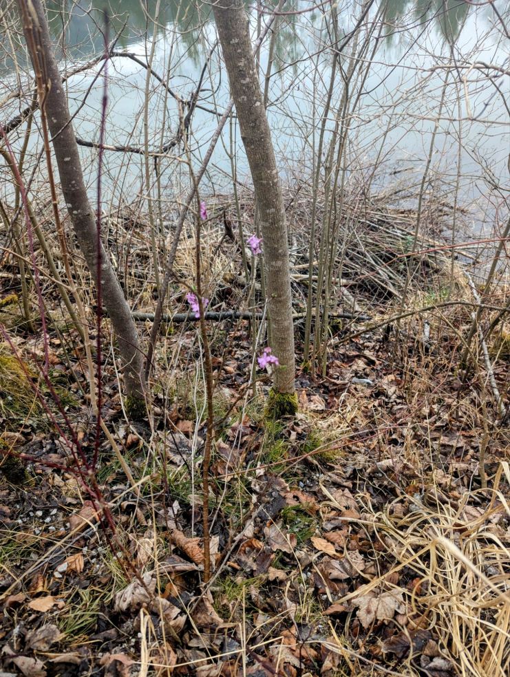Im Vorgarten einer Biberburg habe ich den ersten blühenden Seidelbast entdeckt …