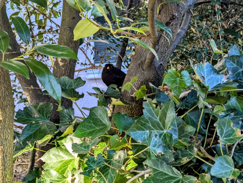 Beim linken Foto, wollte ich den Efeu an der Hausmauer fotografieren, da schaute mir plötzlich eine Amsel in die Augen … Beim rechten Bild überwuchert der Efeu offenbar den Wirt. Der Baum ist im oberen Teil abgestorben. Aber das mag auch schon vorher passiert sein.