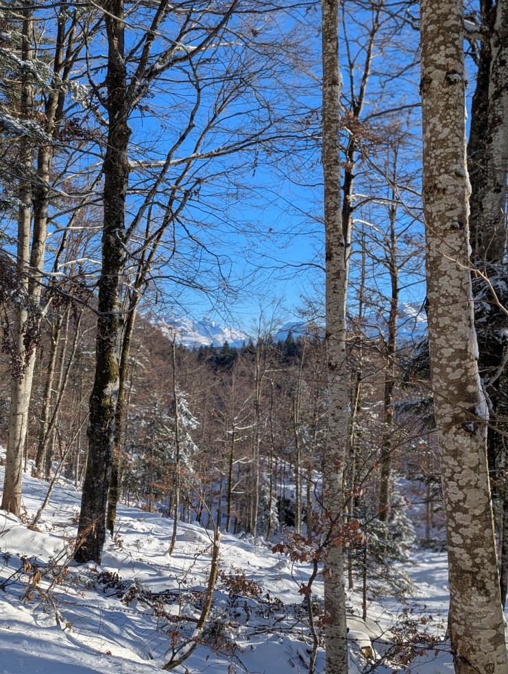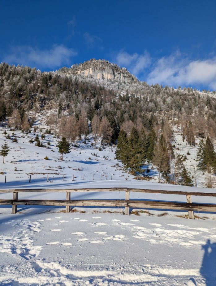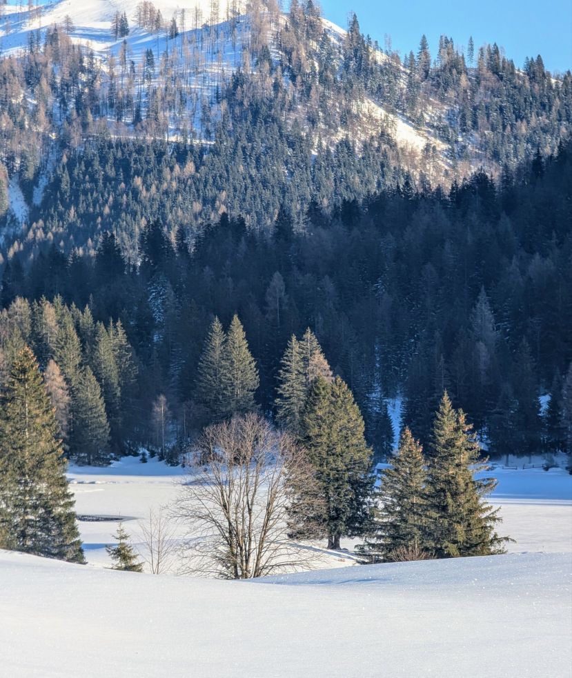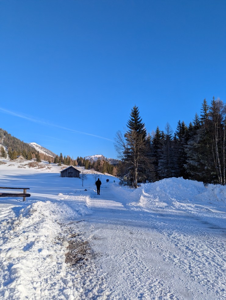 Unter strahlend blauem Himmel wandern wir in der klirrend kalten Luft zum Seewaldsee. Trotz des schönen Wetters sind nicht allzu viele Menschen unterwegs, was mich freut. Unterwegs in der Natur, schätze ich die Stille. Die Straße ist schneebedeckt und glatt. Wegen meiner lädierten Hand bin ich auf der Hut und auch der Techniker mahnt zur Vorsicht. Das kleine Wagnis belohnt uns mit schneereichen An- und Aussichten.