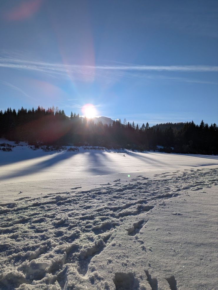 Kurz bevor wir den See erreichen, nehmen wir auf einer sonnenbeschienenen Bank Platz. Der See liegt unter einer Eis- und Schneedecke. Nur mehr eine kleine Wasseröffnung links im Bild ist zu sehen. Weil es schon später Nachmittag ist, steht die Sonne tief und mein Techniker und Alleskönner versucht, die Erde mittels Wanderstöcken in der Rotation zu stoppen, damit ich länger die wärmende Sonne genießen kann. Hach, Männer können so lieb sein …