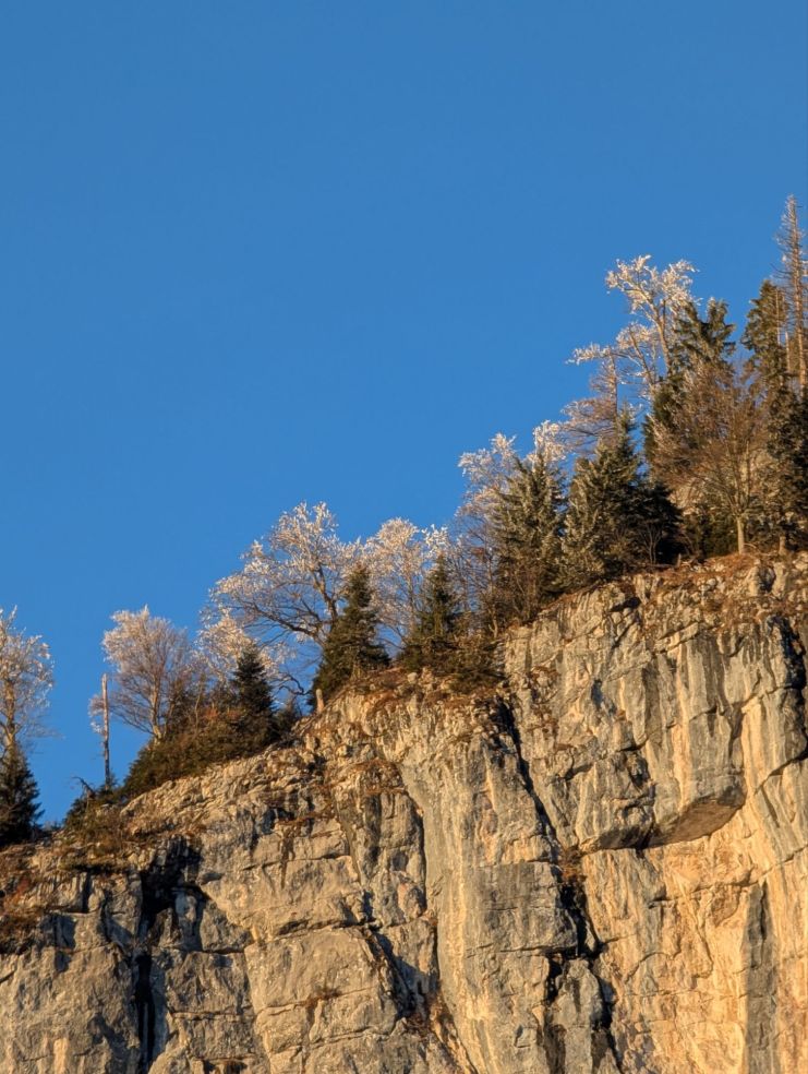Bevor die Sonne endgültig hinter den Bergen verschwindet, beleuchten ihre letzten Strahlen die vereisten Baumspitzen auf dem Bergrücken gegenüber. Ein perfekter Abschluss einer romantischen Winterwanderung in Salzburgs herrlicher Landschaft.
