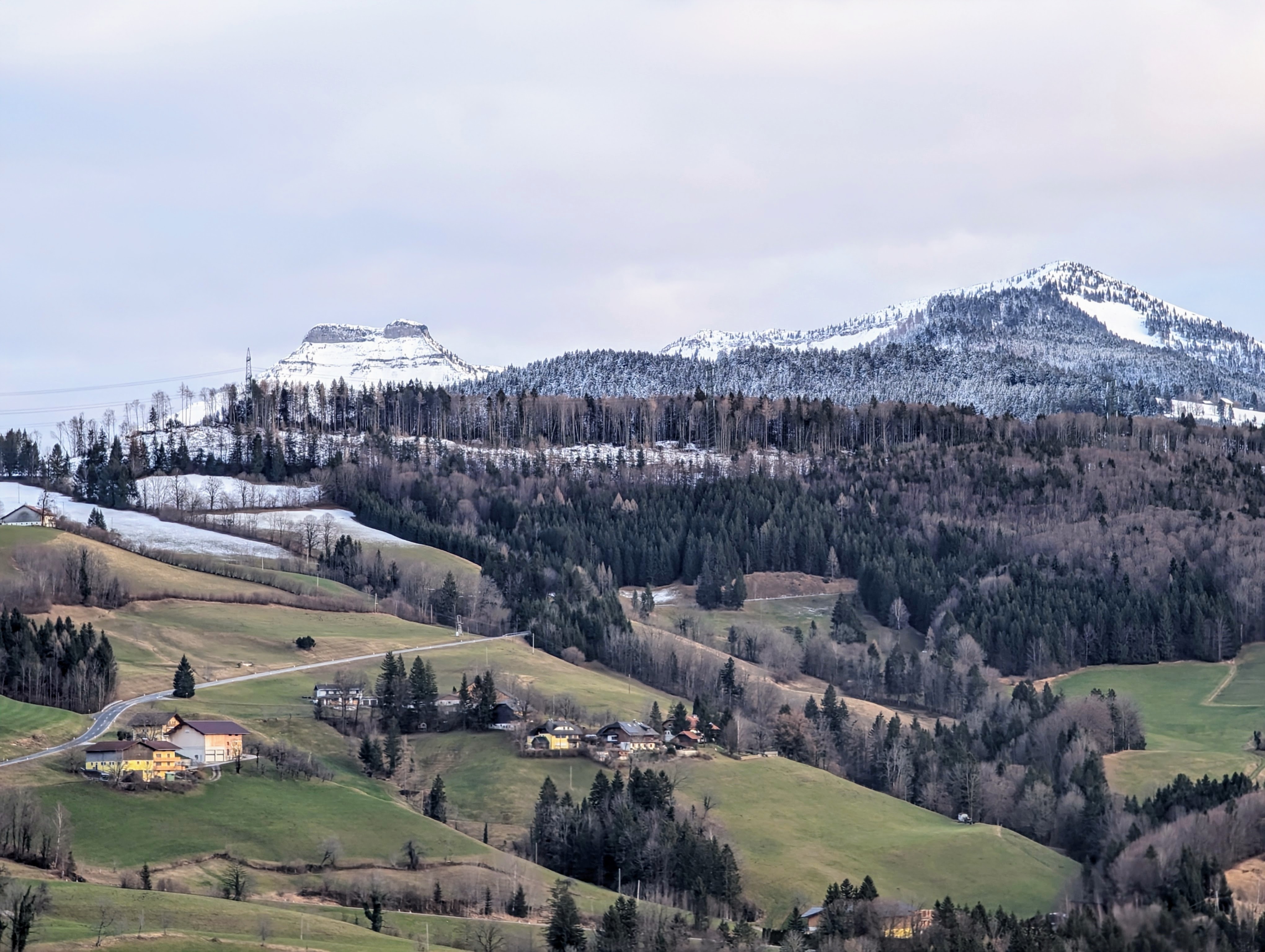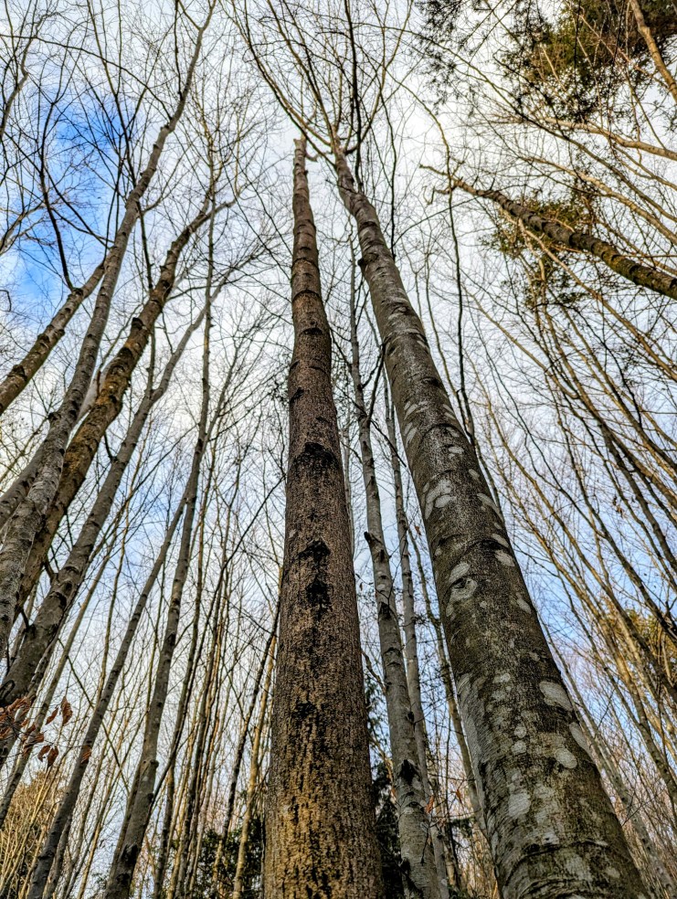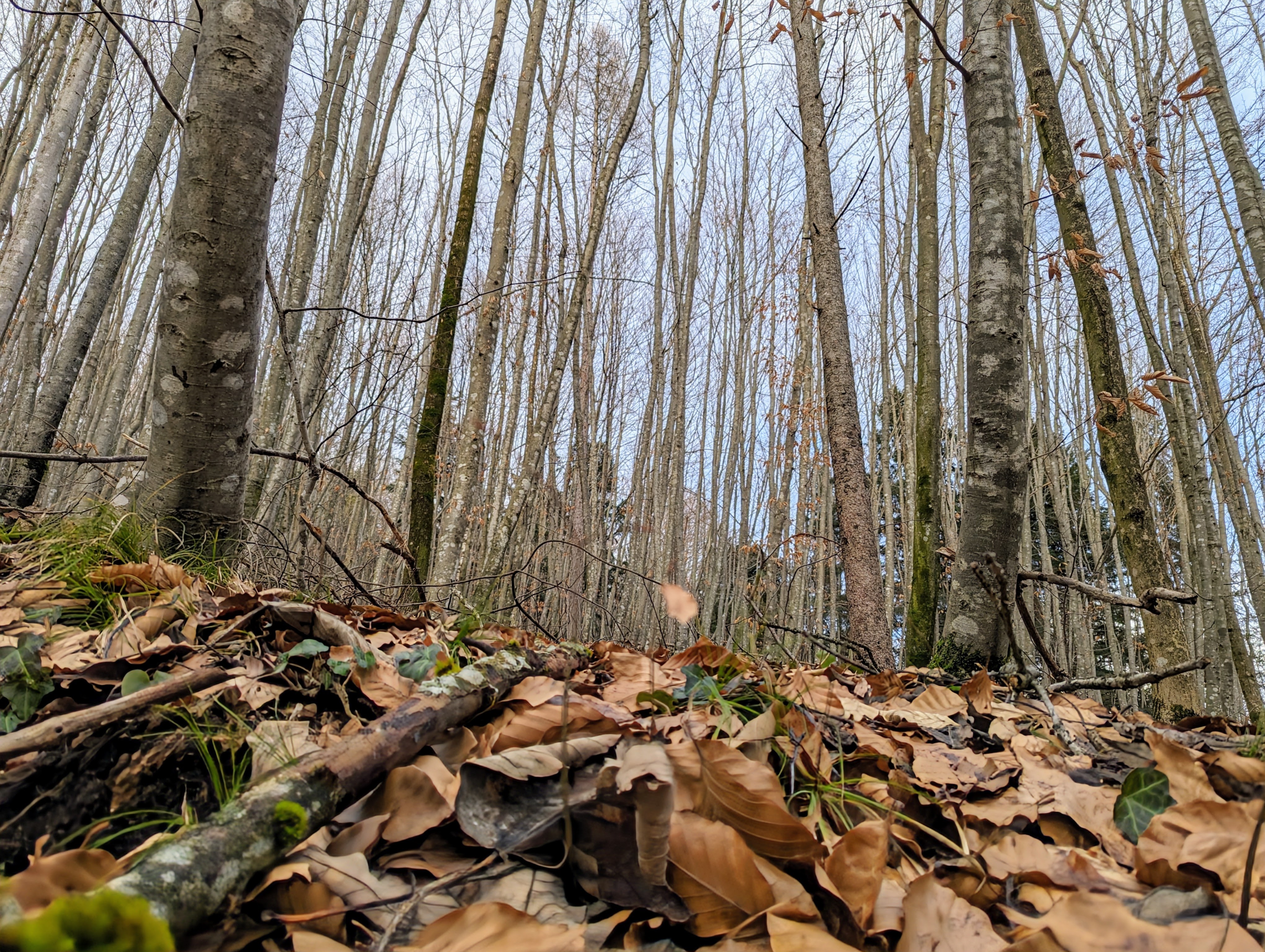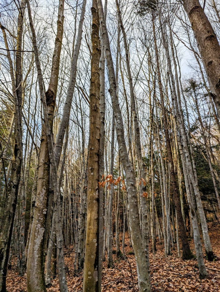 Am Neujahrstag unternahmen wir eine kleine Wanderung. Etwas müde von Silvester, nur 3,5 km leicht bergauf. Auf einem Forstweg in einem Mischwald aus Fichten und Buchen. Es ist ein Jungwald, denn die Stämme sind noch in der Pubertät. Schmal und lang. Sie haben es eilig mit dem in den Himmel wachsen.