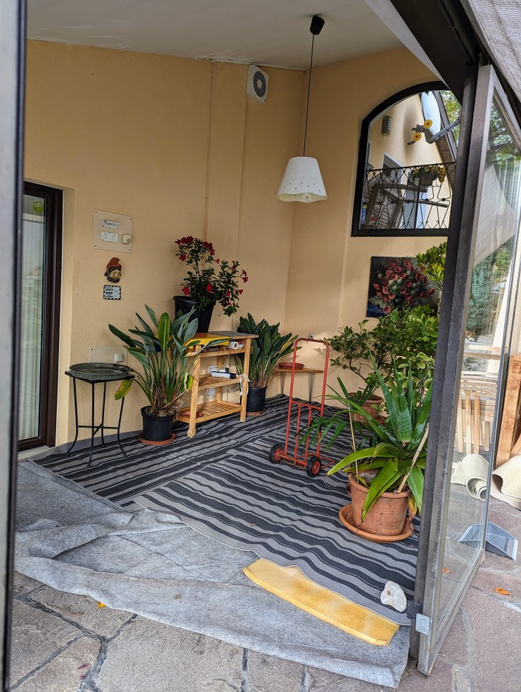 Apropos Wintergarten; der war als Winterquartier für alle Topfpflanzen gleich nach der Ankunft fällig. Leider wurde der Techniker krank und lag zwei Tage darnieder. Die Arbeit duldete aber keinen Aufschub. Also packte ich es an, legte den Wintergarten mit kältedämmenden Matten aus und stemmte die Pflanzen mithilfe unserer uralten, aber robusten roten Sackkarre in das Winterlager. Die Karre stammt noch vom Vater meines Technikers und hat bald hundert Jahre auf dem Buckel. Aber sie funktioniert auch bei schwersten Töpfen über Stock und Stein. Da kann sich die Elektronik mal was abschauen.