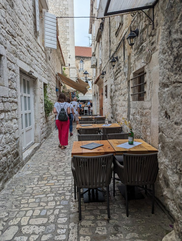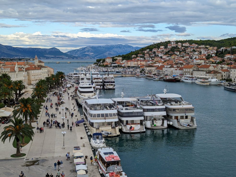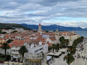 Nach einer kühlen Nacht folgt ein weiterer trüber Tag. Es hat aufgehört zu regnen. Ein Taxiboot bringt uns nach Trogir. Touristenströme schieben sich durch die Gassen. Alle 15 Minuten landet ein Flugzeug. Wir wollen gar nicht wissen, was hier in der Hochsaison los ist. Nach dem Abendessen mittelmäßiger Qualität zu überteuerten Preisen geht es abends mit dem Taxiboot zurück. Morgen soll die Sonne wieder scheinen. Wir freuen uns auf die angekündigten 28 Grad und beschließen noch einen Tag zu bleiben.