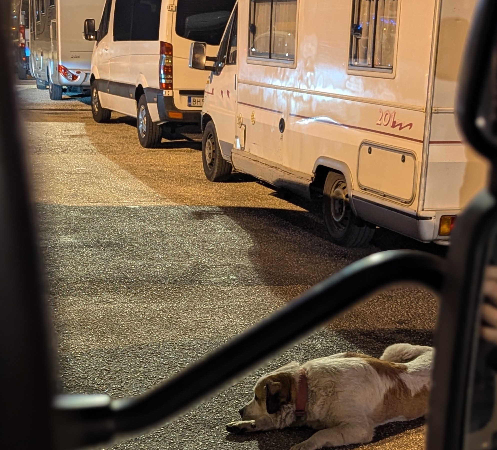 Ein griechischer Streuner zwischen den Wartenden. Ob er wohl mitgenommen werden möchte? 🌞🌞🌞